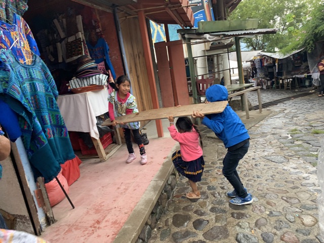 These two kids were carrying a board, and the littlest one was reaching up, pretending to help, while all of them giggled.