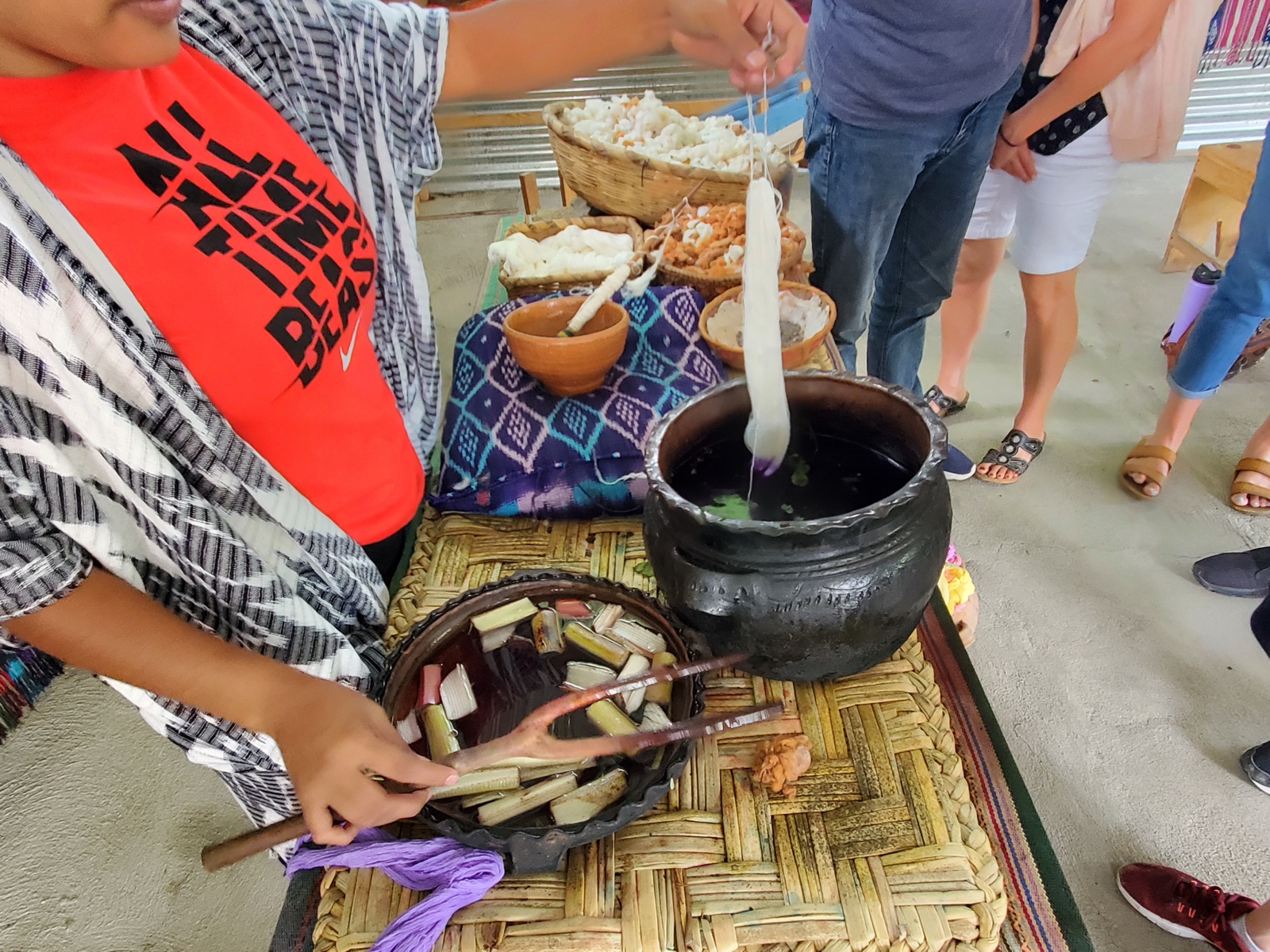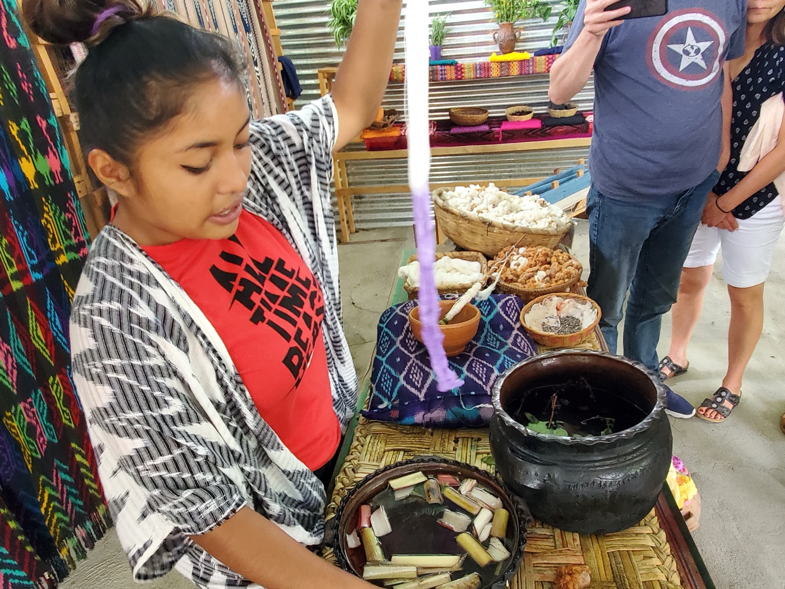The gal then demonstrated dying some cotton in purple dye, using basil that had been boiled for two hours.