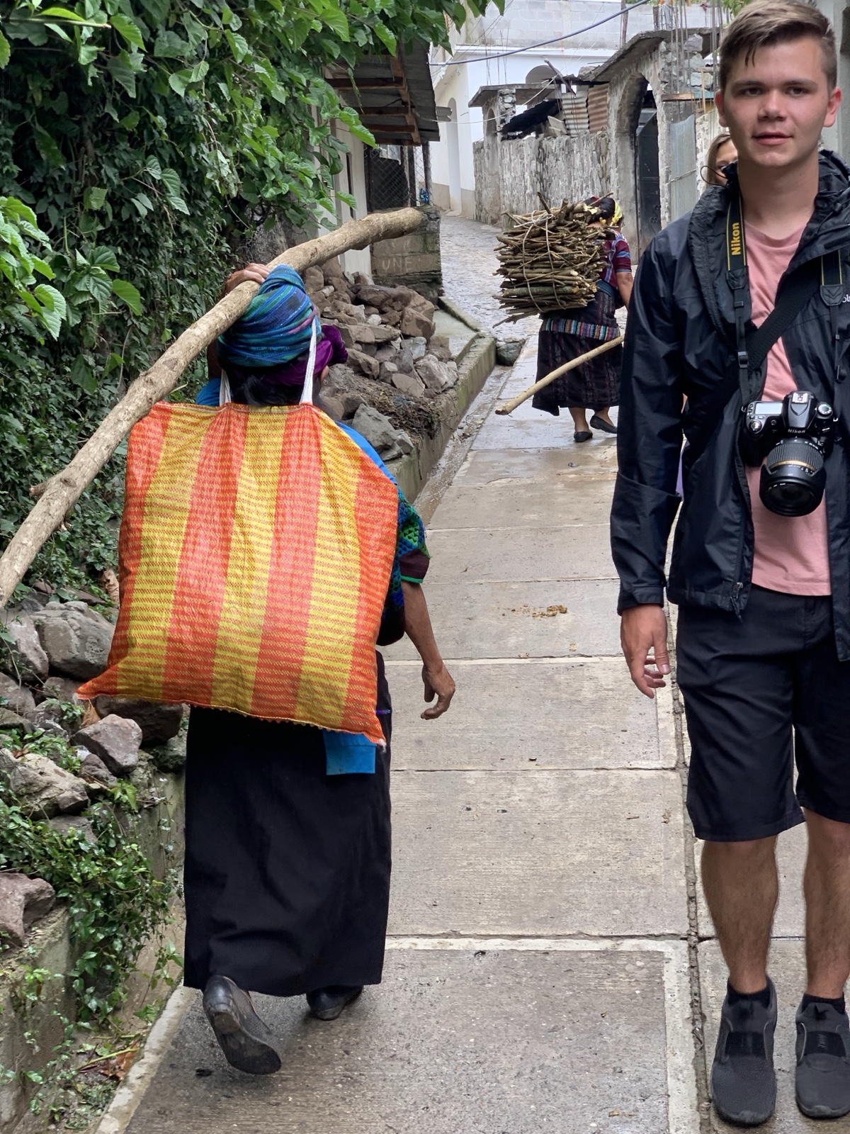 These ladies walked by with huge branches on their heads.