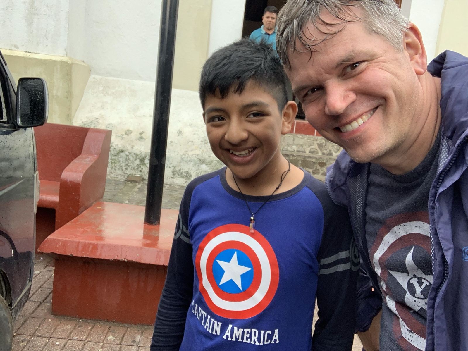When I came out, I saw a kid with a Captain America shirt on. I had one, too, so I walked up to him and said "¡Amigo!" while pointing at my shirt, and then took a selfie with him.