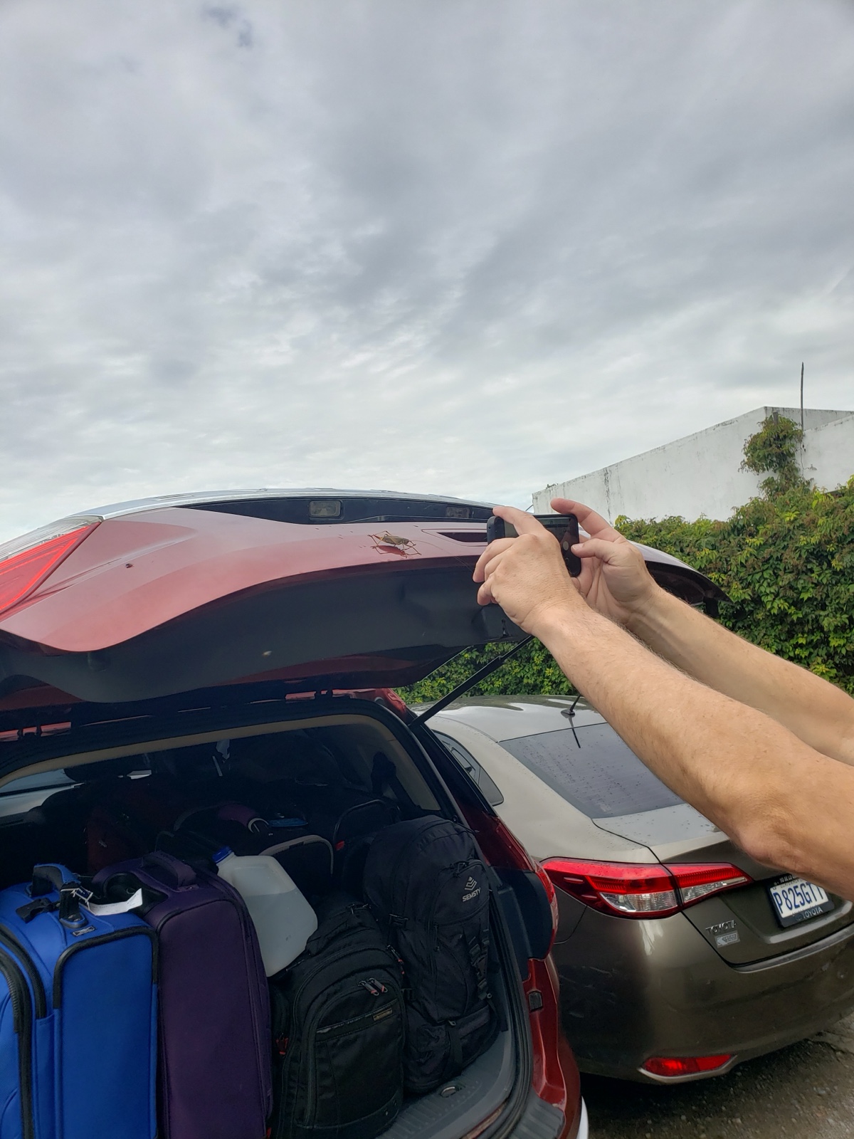 The kids noticed a little stowaway on the trunk of the SUV.