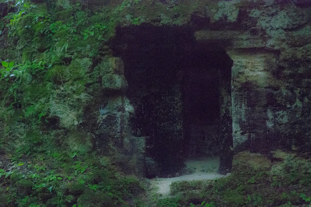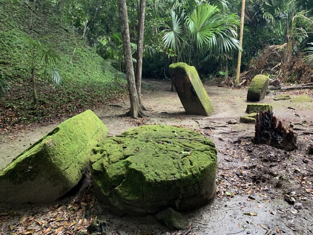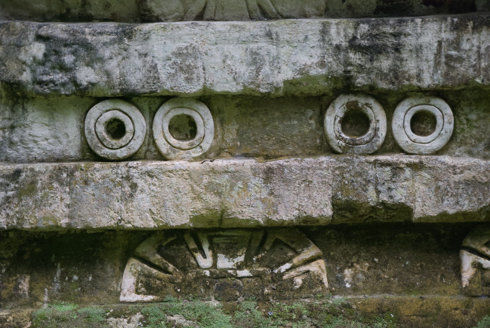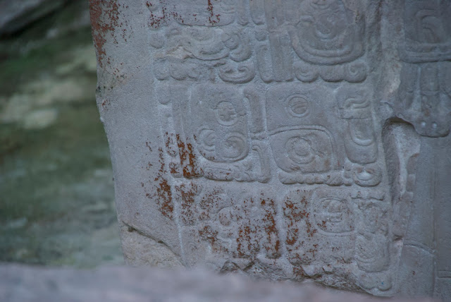 By then, it was very dark, especially down in the jungle. Reyes lit the way with his flashlight, and stopped to show us some carvings in one more building.