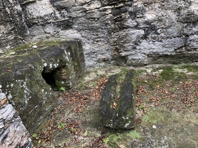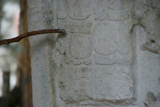 This building is called "Mahler's Palace," named after an early explorer who used it as his base of operations when he visited there in 1895 and 1904. It was built by Tax Ain II, the 29th ruler of Tikal, who ascended to the throne in 768 A.D. He was also the one who built the twin pyramids in Group Q that we climbed earlier, and perhaps Temple V. (I'll bet the "9" symbol we saw on the stele there was part of "29", meaning, "29th ruler of Tikal").