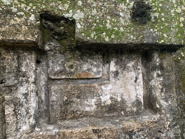 Often when enlarging a pyramid, they will cover it in rubble, and then put a new finished layer on top of that. Here you can see an earlier staircase underneath with rubble added on top. (The finished layer above that likely deteriorated in the weather and jungle growth).