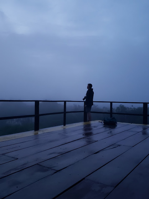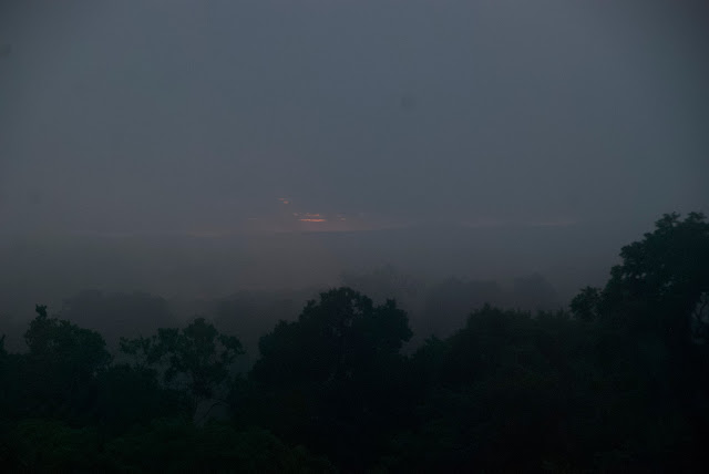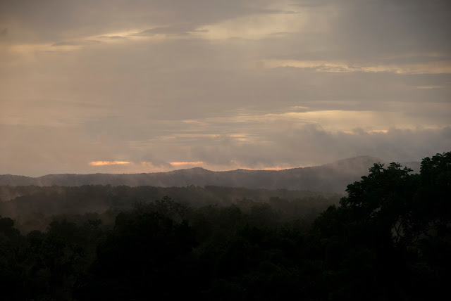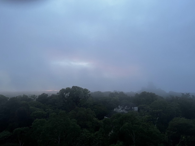 We had gotten the extra tickets (and hired Reyes for longer) in order to allow us to do a "sunset tour" and stay in the park after 5pm. It had been raining for much of the afternoon, so we suspected there would be no sunset to see at all. As it turned out, there wasn't much, but the clouds and fog thinned enough to provide us a few glimpses of the sunset colors in the distance as we reached the top of the pyramid.