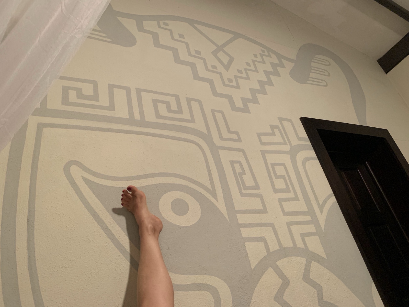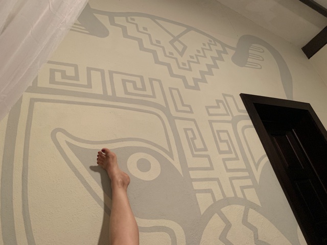 The wall of our hotel room had a Mayan-looking decoration in the shape of a huge jaguar head. And a foot.