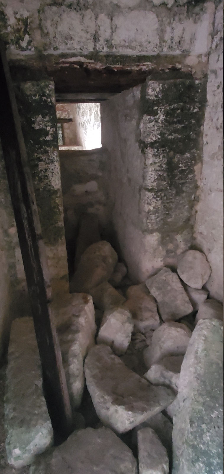 It used to be a two-story building, but the top story has collapsed. There are still doorways on the lower floor, and the upper floor has the bottoms of what must have been windows.