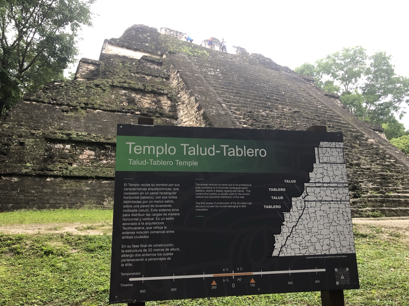 The "Talud-Tablero Temple" (structure 5C-49) has layers that alternate between diagonal "Talud" sections and vertical "Tablero" sections. It is 22 meters (75 feet) tall, and was built in five phases, from the 3rd century A.D. to 700 A.D. It is the second largest structure in the Lost World complex.