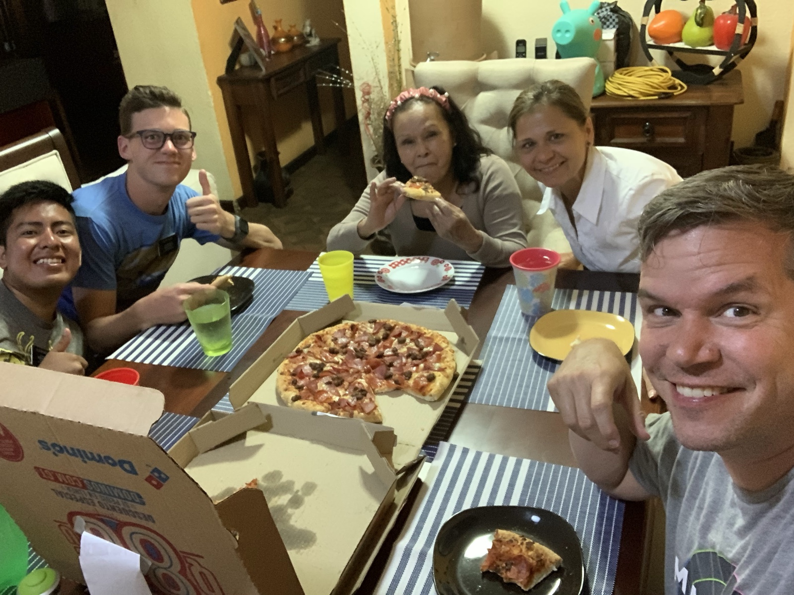 Meanwhile, we met the missionaries who lived in the house across the street, and they helped us navigate the Domino's app so that we could order some pizza and have it delivered. When the app was being difficult, we suggested driving over to pick it up (since we could see the sign from the roof), but the grandma said it was too dangerous to drive even that far at night. So we ordered it and invited the elders to eat with us when it arrived.