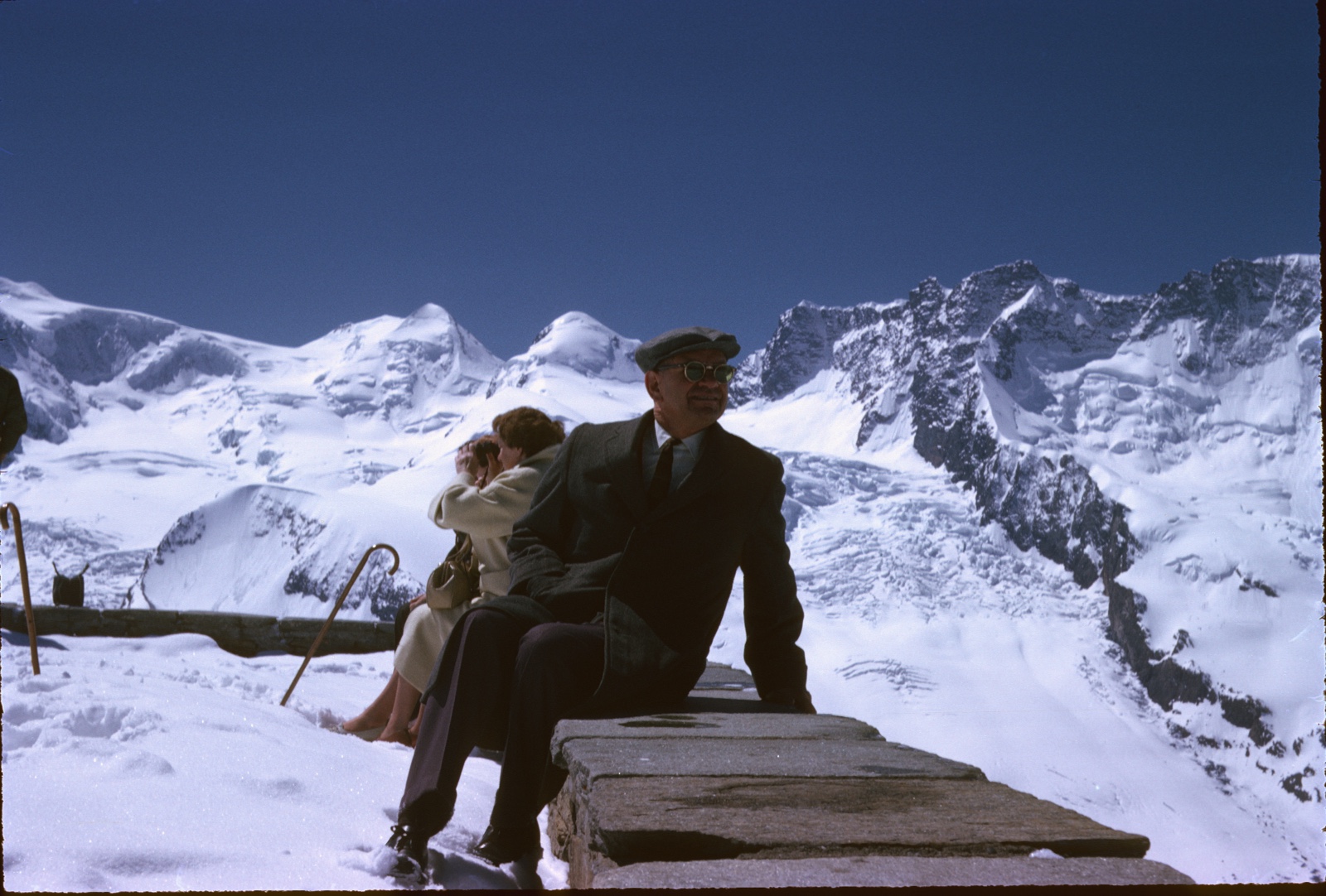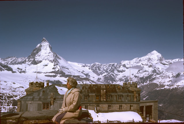 When my grandparents went to Zermatt in May 1962, they apparently went up to Gernergrat as well. Here's my grandma Thelma Merrill sitting on the wall above the same building. Apparently they hadn't built the observatories into the turrets yet.
