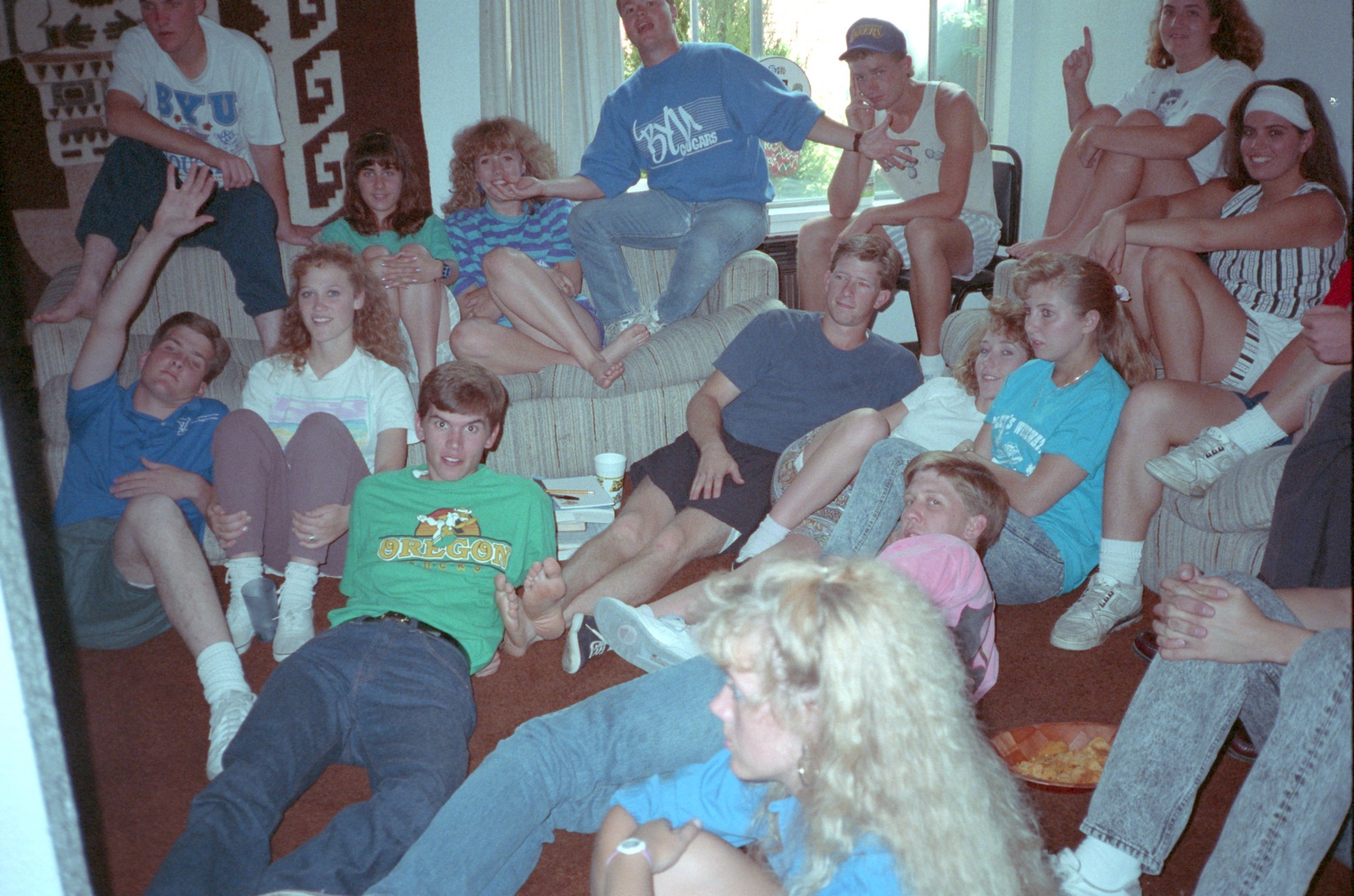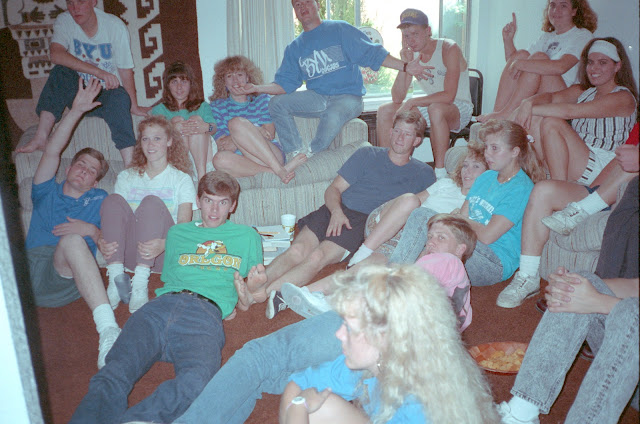 Around October of 1990, everyone in our apartment got dumped or was otherwise disappointed in the dating department. About that time, Kelly started dating a girl named Maria. Their first date was when he invited her to our apartment to watch BYU play against the Oregon Ducks. Here are Kelly & Maria in the bottom left, with me obnoxiously wearing my Oregon Ducks shirt even though I was a BYU student.