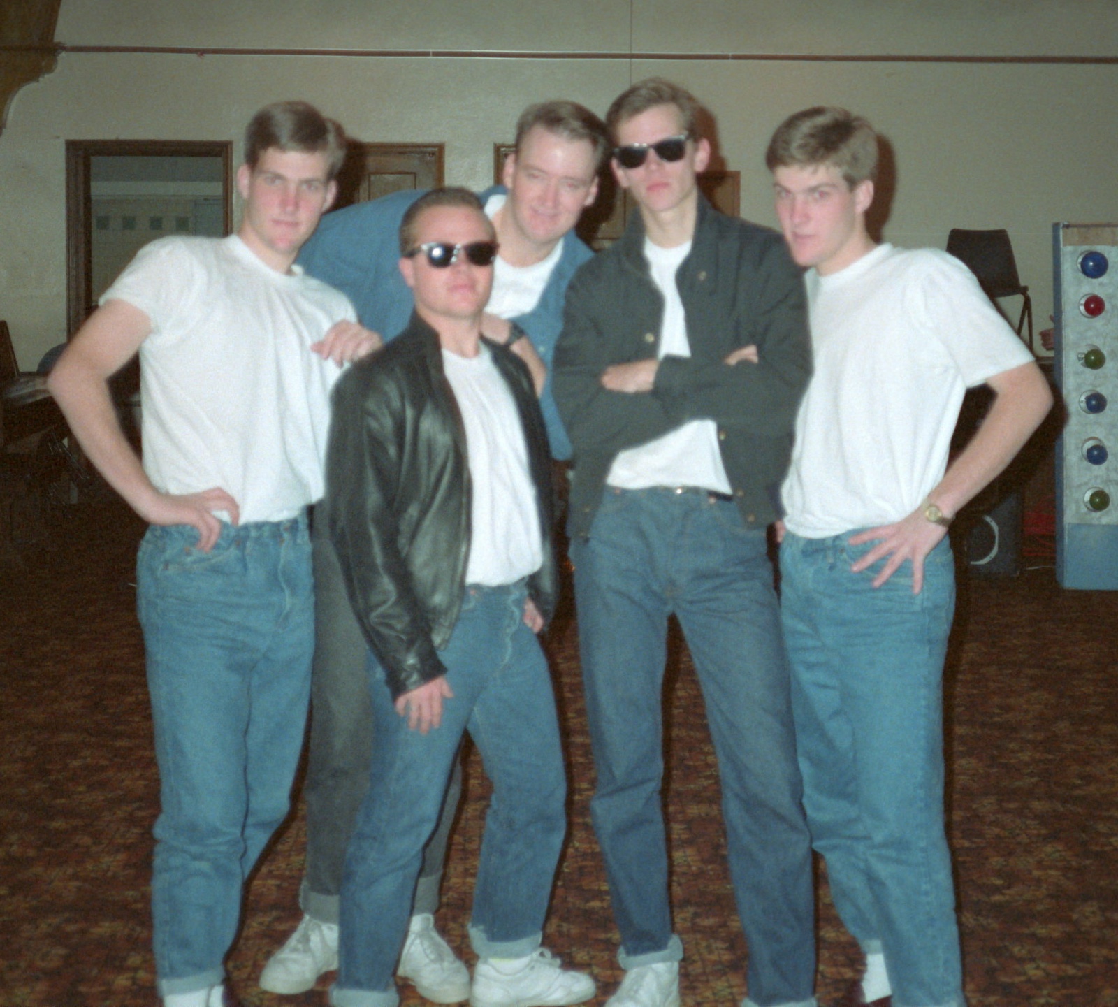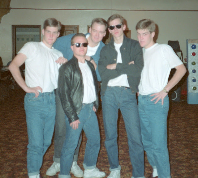 During the 1990-1991 school year at Brigham Young University, I was roommates with Kelly and Kenneth Stotts. They were identical twins, and I remember one evening talking to one of them for 45 minutes, when suddenly the phone rang. When I answered, someone asked, "Is Kelly there?" and I looked over and said, "I don't know..." But I guessed it was Kelly and was right. Soon thereafter, I could tell them apart easily. Here's a picture from a 50s dance we had, with the twins on the two sides.