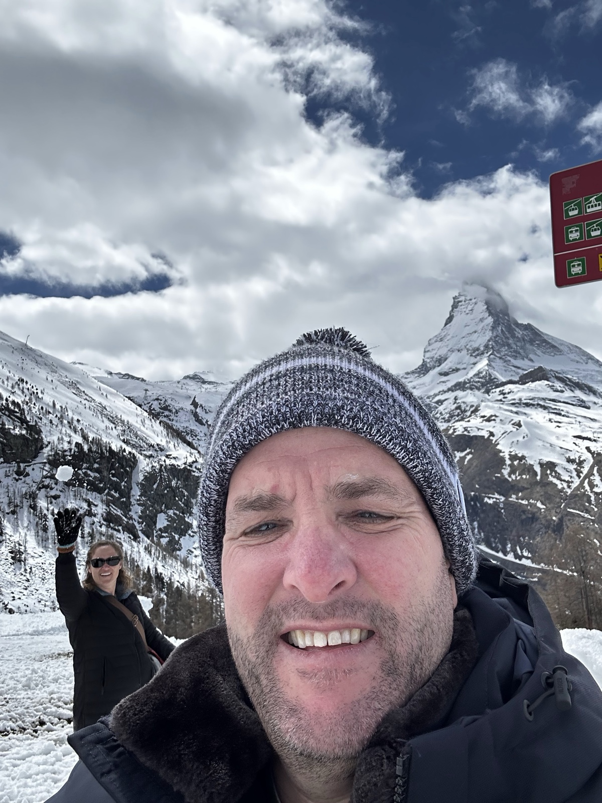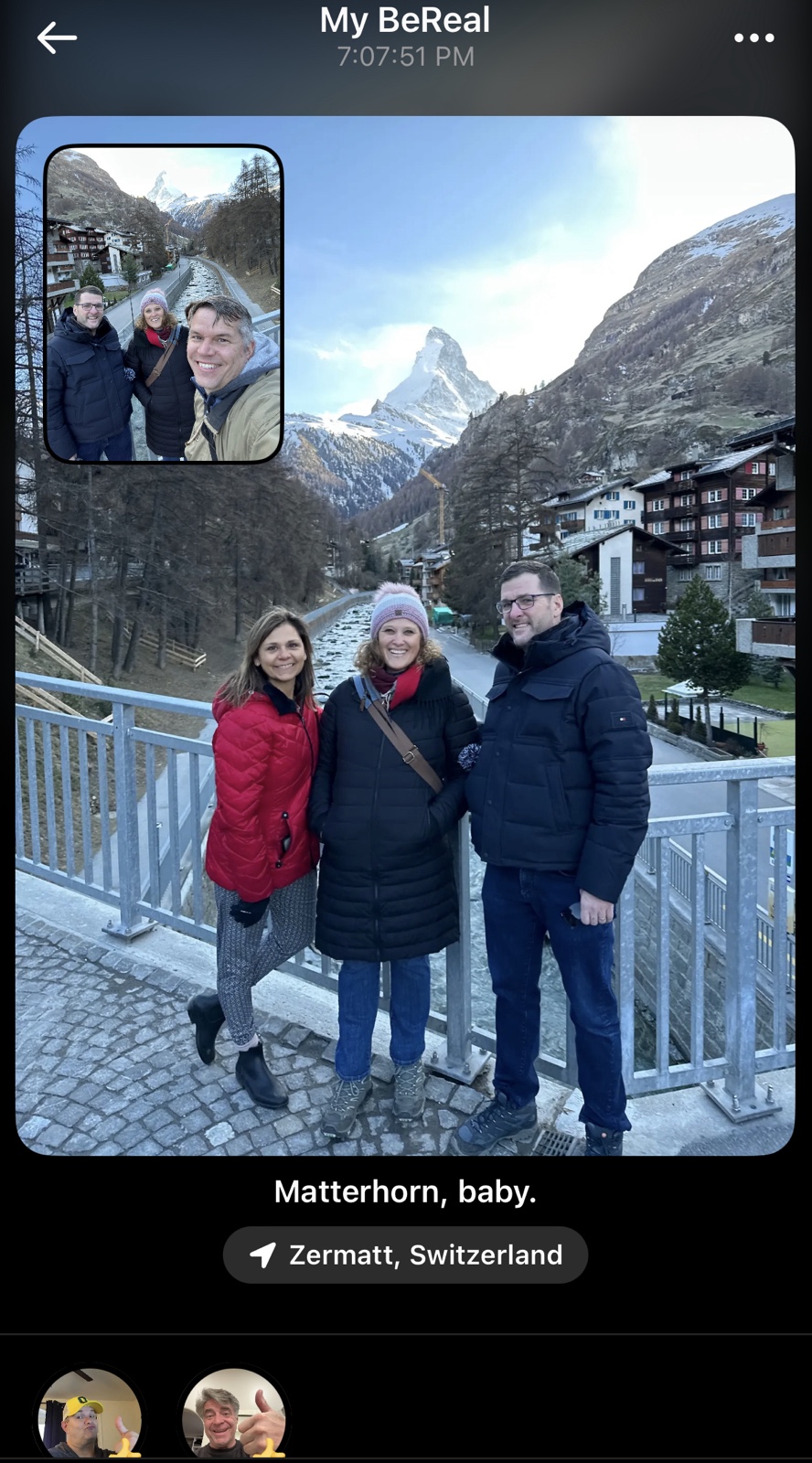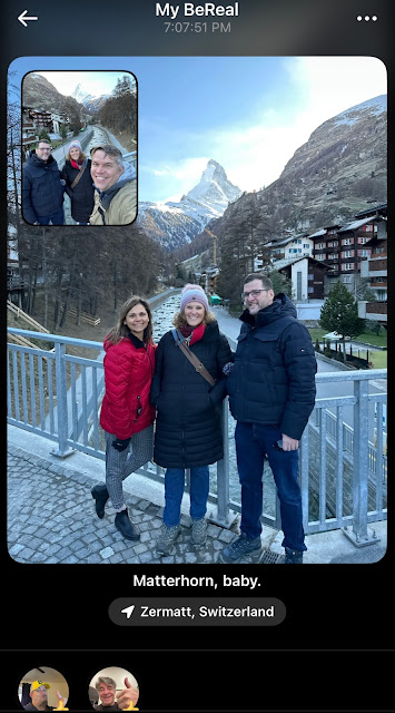 As we approached a bridge that has a spectacular view of the legendary Matterhorn, the "BeReal" for the day happened to go off, so we snapped a picture.