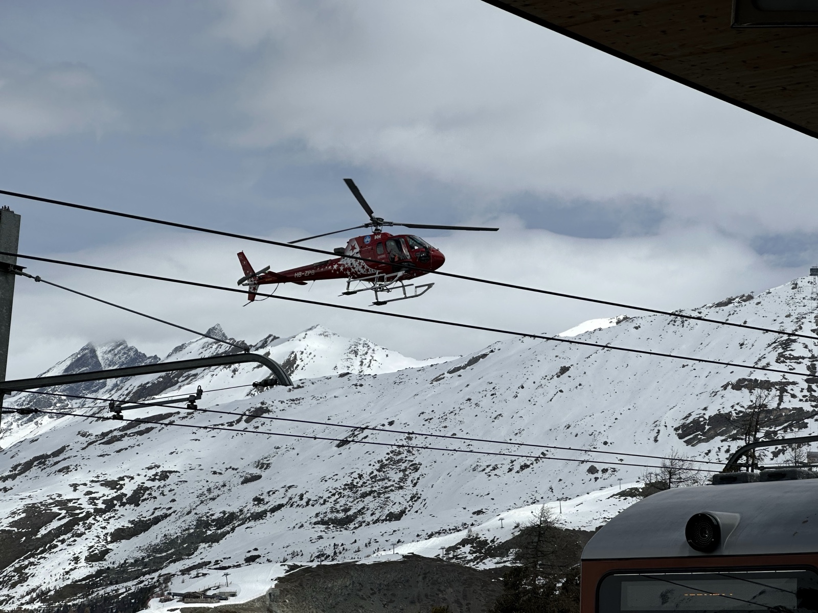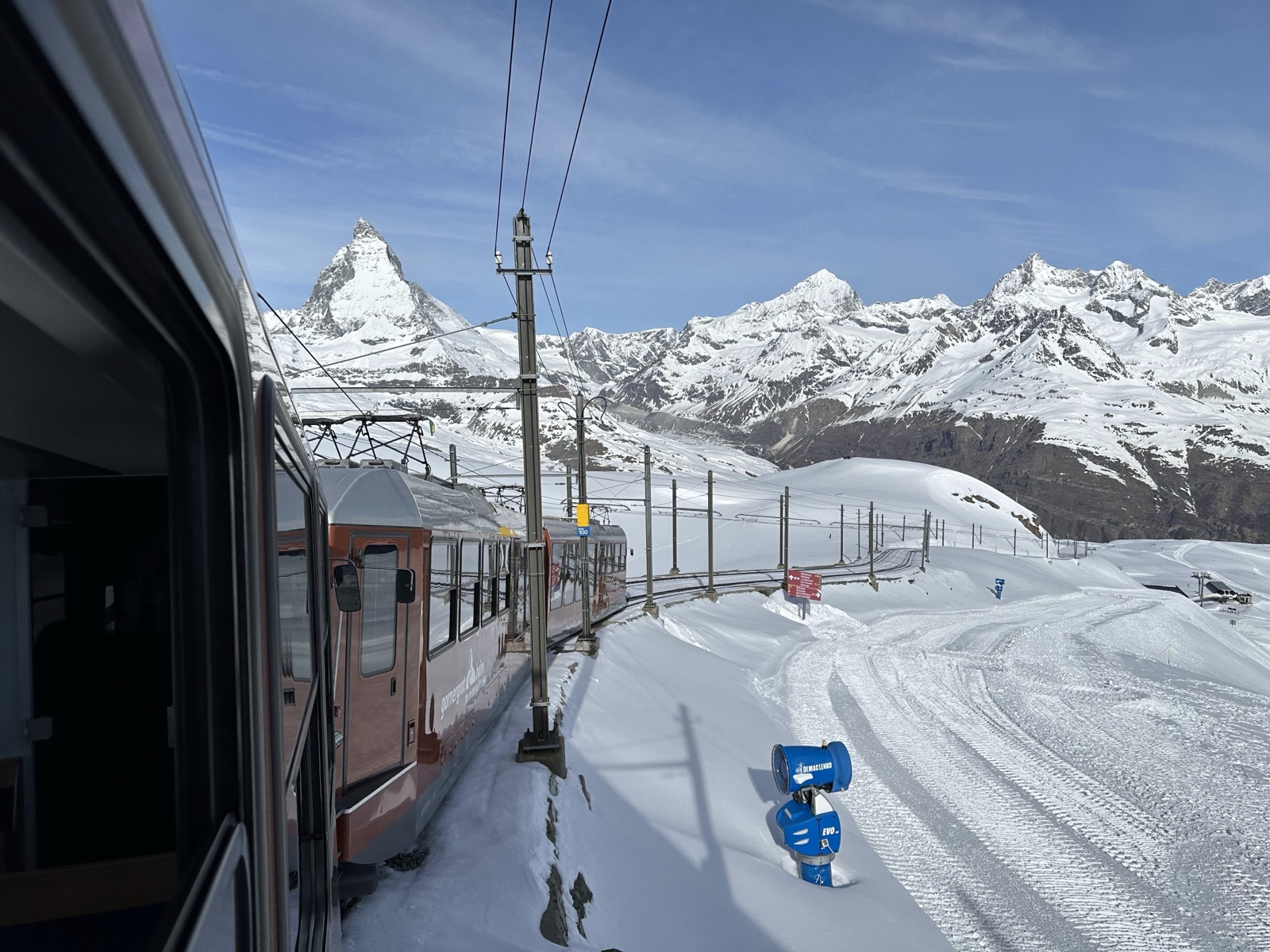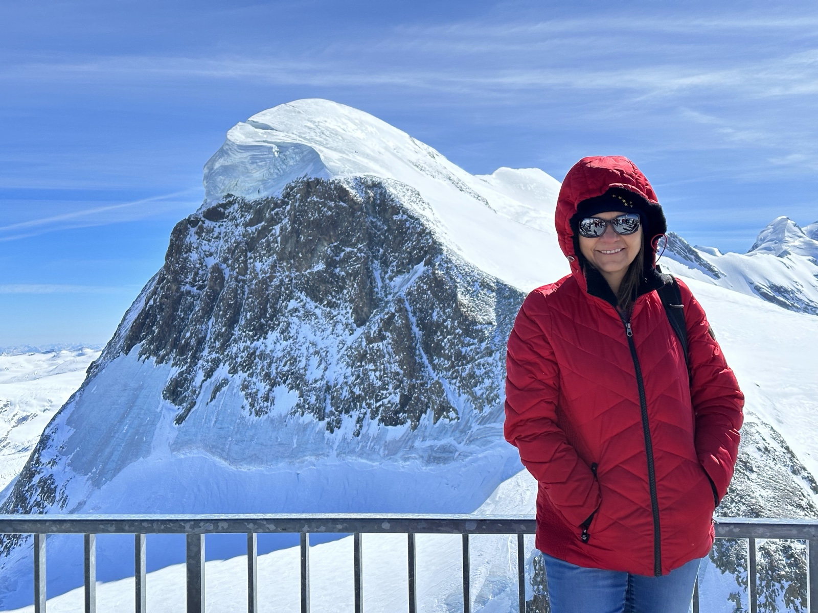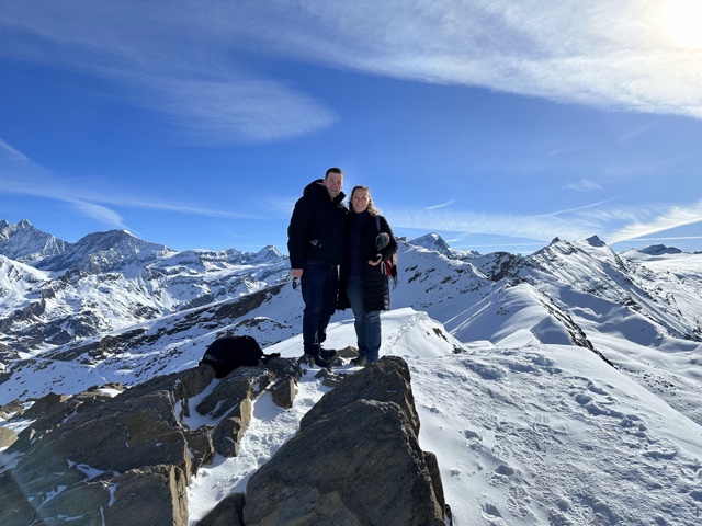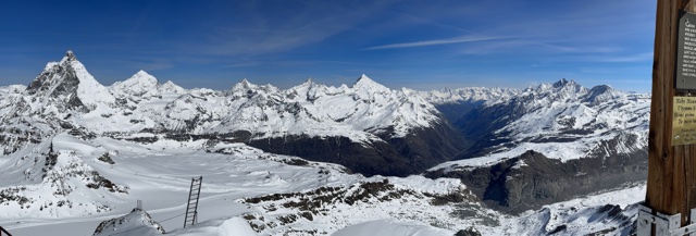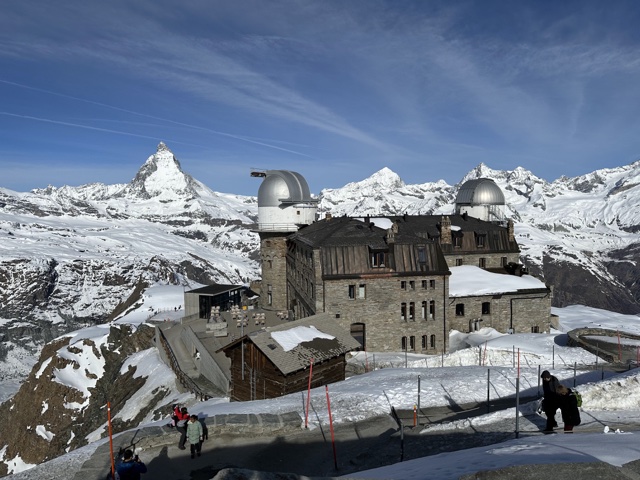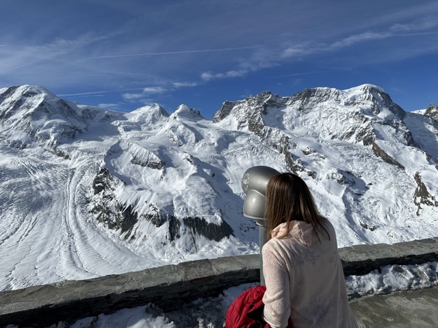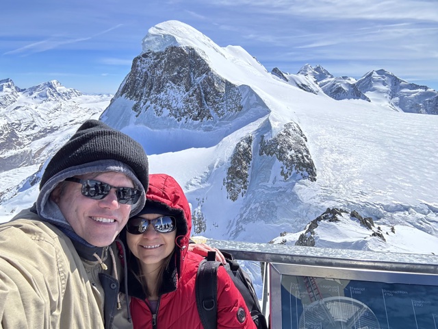 There was a cool telescope there that would show the names of the mountains as you pointed at them. (Breithorn is visible in the upper right, and just to the right of that you can just see the viewpoint we went to the day before).