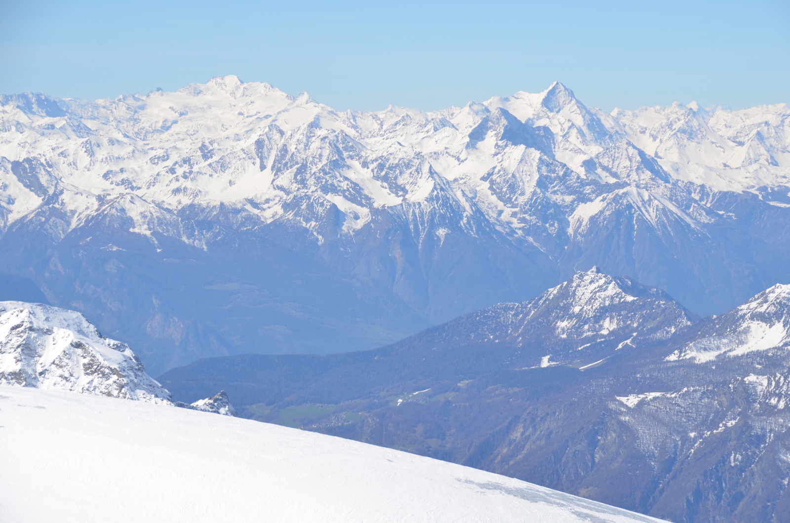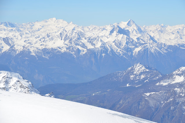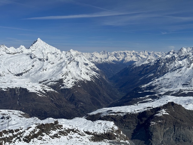 In the opposite direction from Zermatt, you could see the valleys of Italy below the distant peaks.