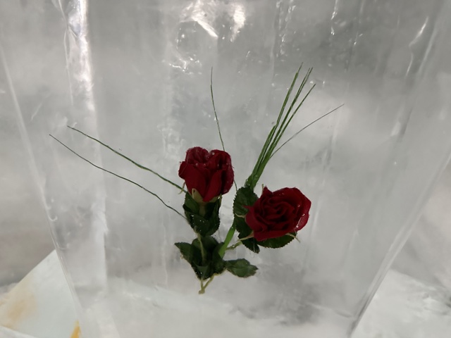 These roses were suspended in a block of ice.