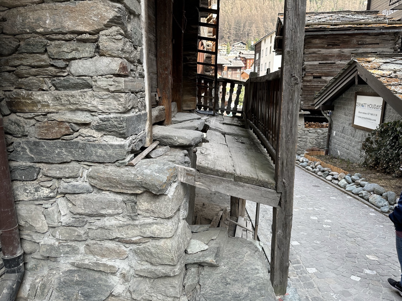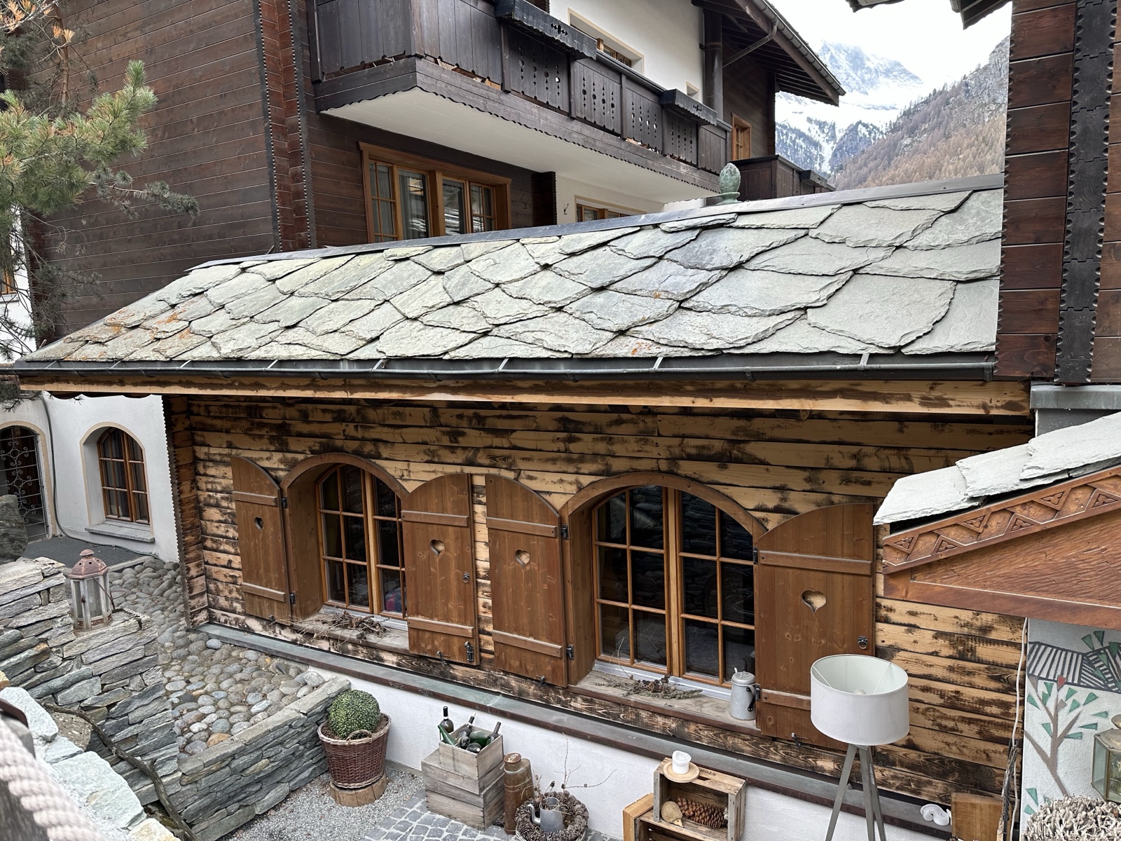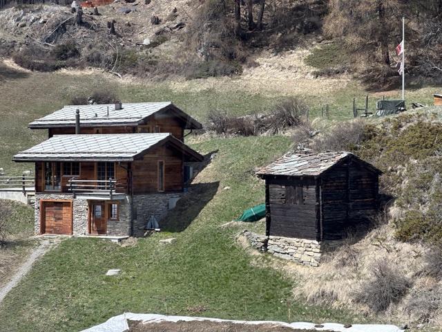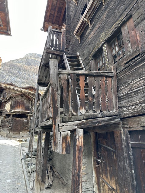 Finally we arrived back down in the green valley of Zermatt. Here you can see some of the traditional stone slab shingles. Some newer buildings use uniform squares, and older ones use random shapes.