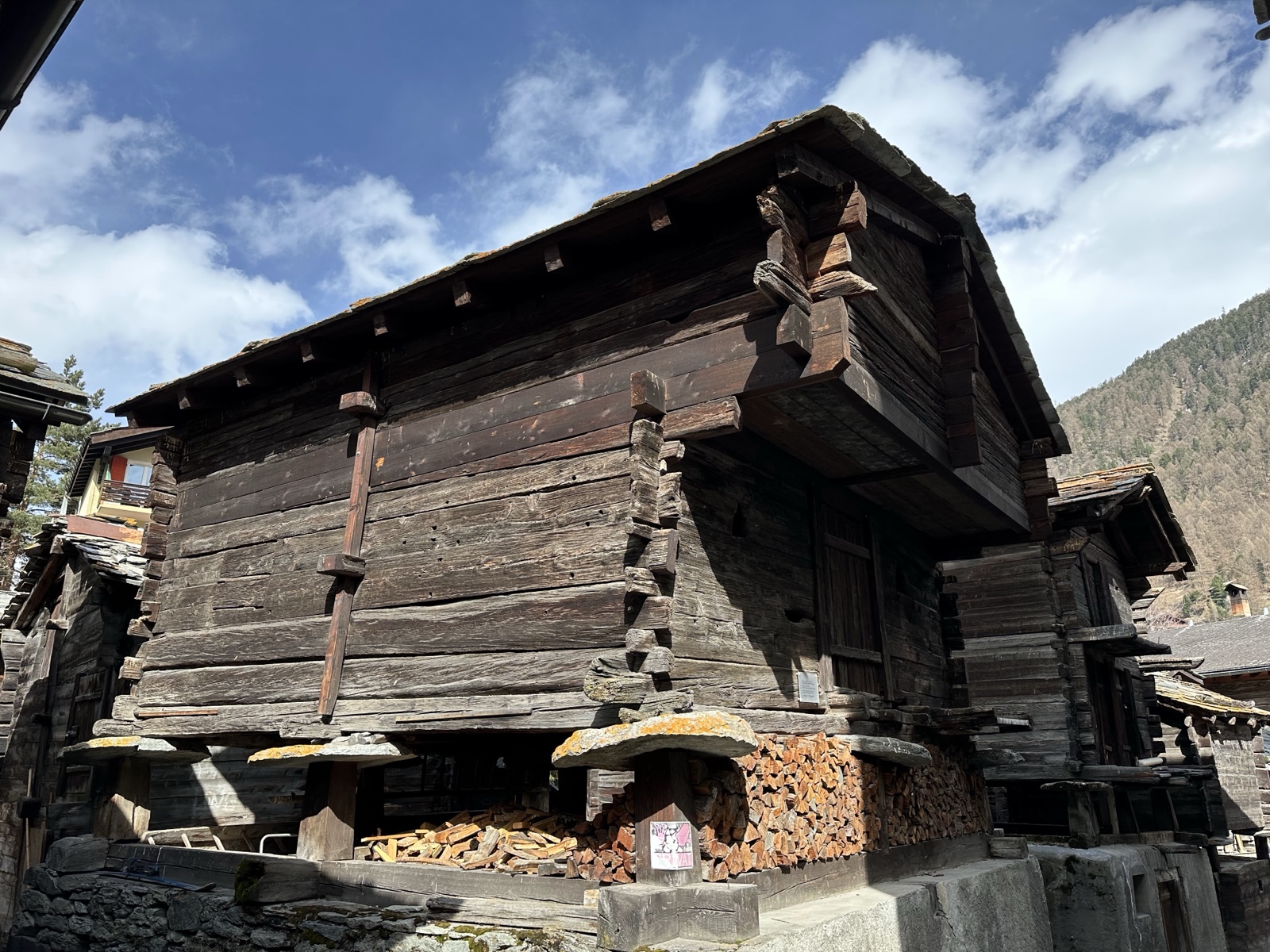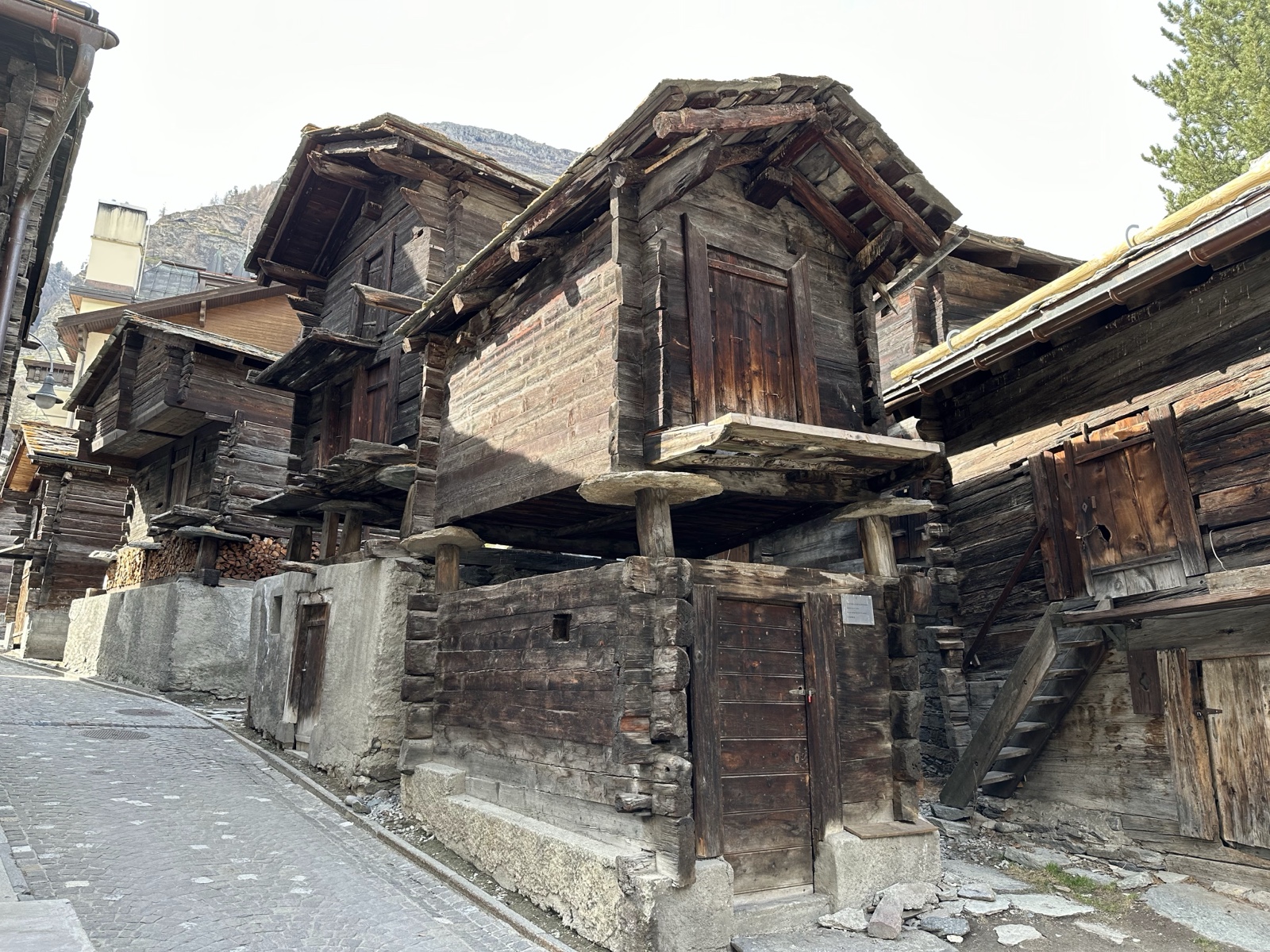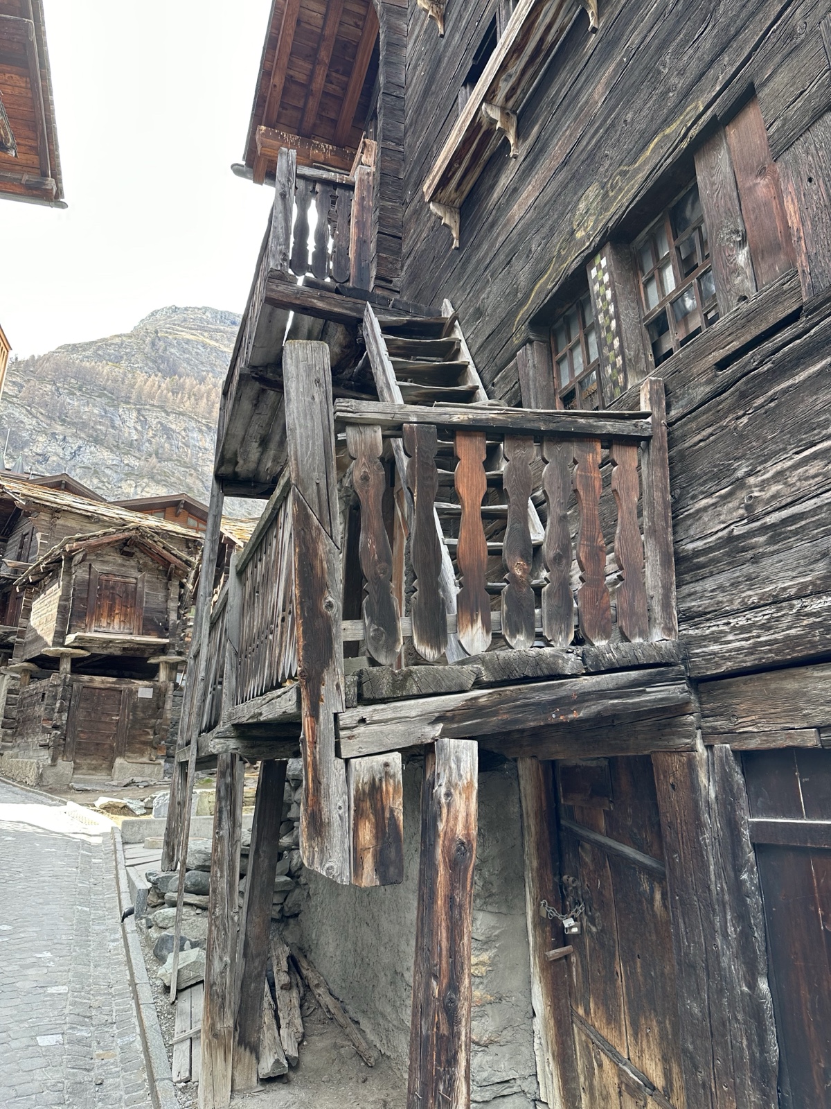 Finally we arrived back down in the green valley of Zermatt. Here you can see some of the traditional stone slab shingles. Some newer buildings use uniform squares, and older ones use random shapes.