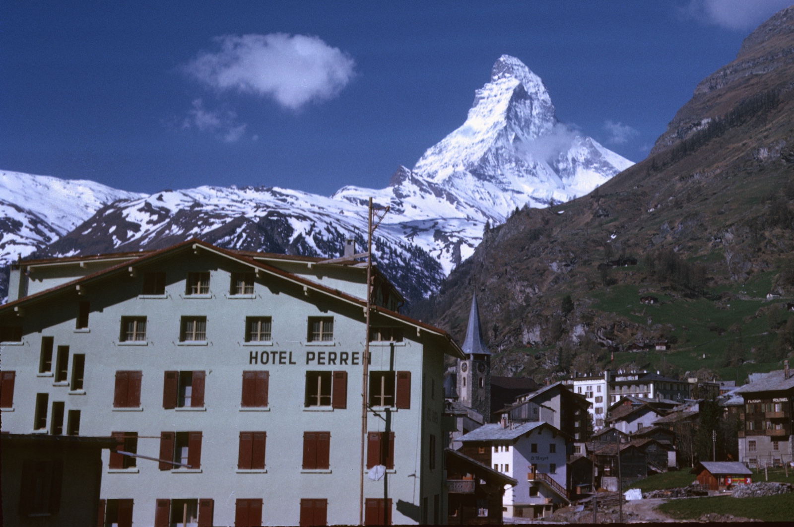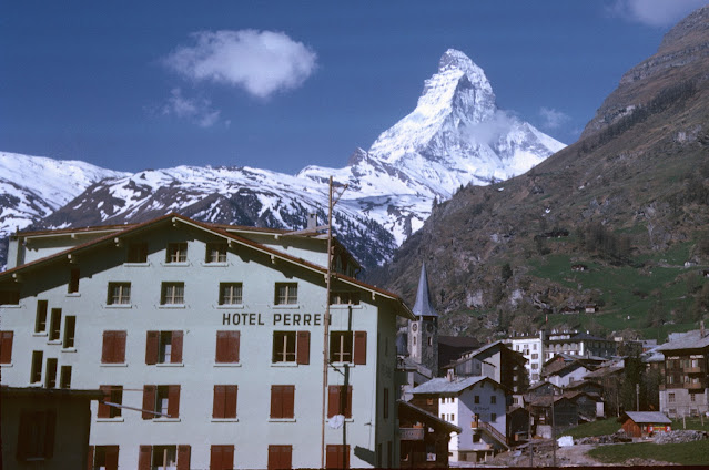 My grandparents, Malcolm & Thelma Merrill, often went to Switzerland because of my grandfather's work with the World Health Organization in Geneva. After our trip, I looked through my grandpa's Switzerland pictures (which I had scanned from his slide film) and found this picture he had taken in Zermatt in May, 1962. Notice that it's at almost the same angle with the same buildings in view. You can see the Matterhorn, the church, and this hotel in the foreground, which has added some balconies, but has enough of the same windows that you can tell it's the same building.