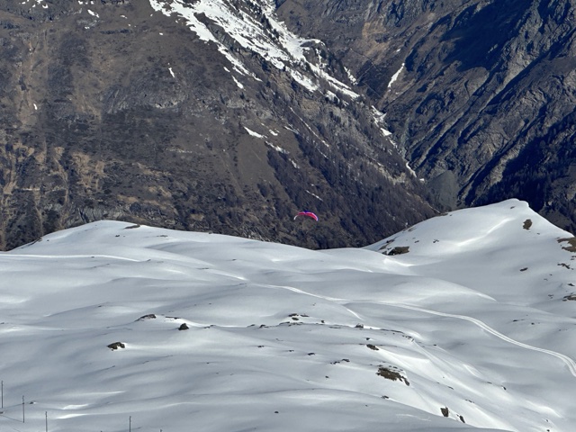 We saw paragliders running off of the snowy hills and floating into the air.