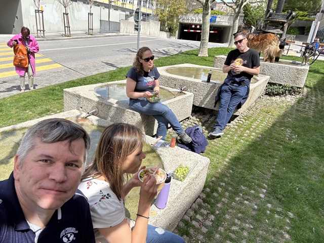We did another Coop grocery store lunch and ate by a fountain. This time I did a curry chicken sandwich and a mango lassi (an Indian yogurt drink). Very tasty, it turned out.