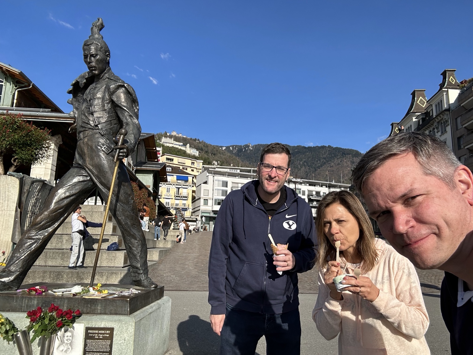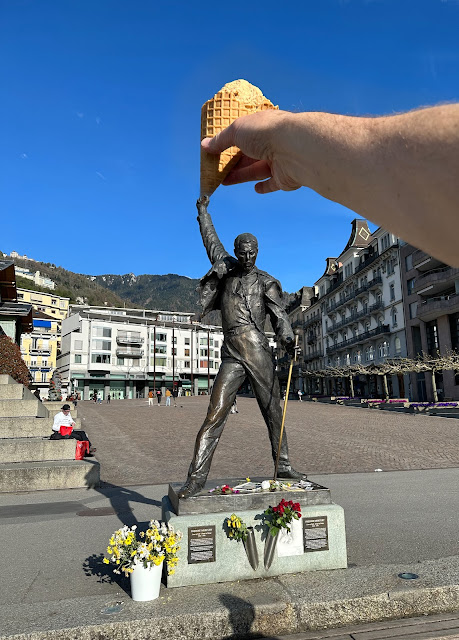 The rock band Queen recorded several albums in Montreux beginning in the 1970s, and Freddy Mercury (the lead singer) ended up spending about half his time in Montreux because of the peaceful environment there. There is a statue of him near a sitting area overlooking the lake.