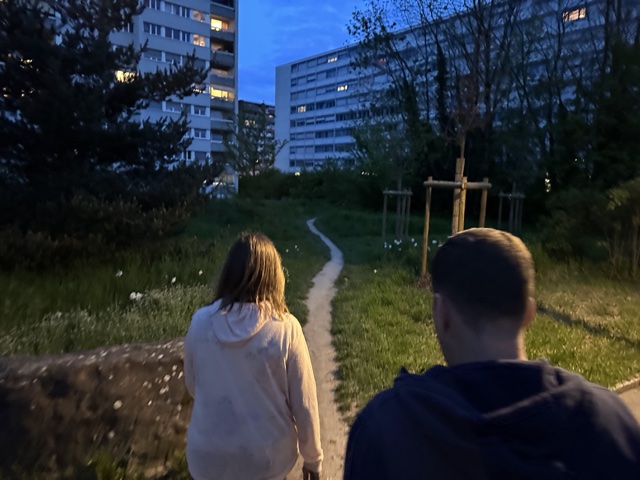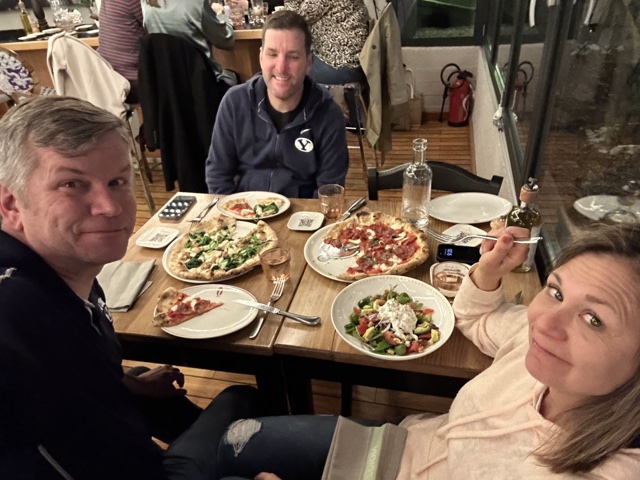 Maria was at choir practice until late, so the rest of us walked through several dark paths to get to a pizza place for dinner.