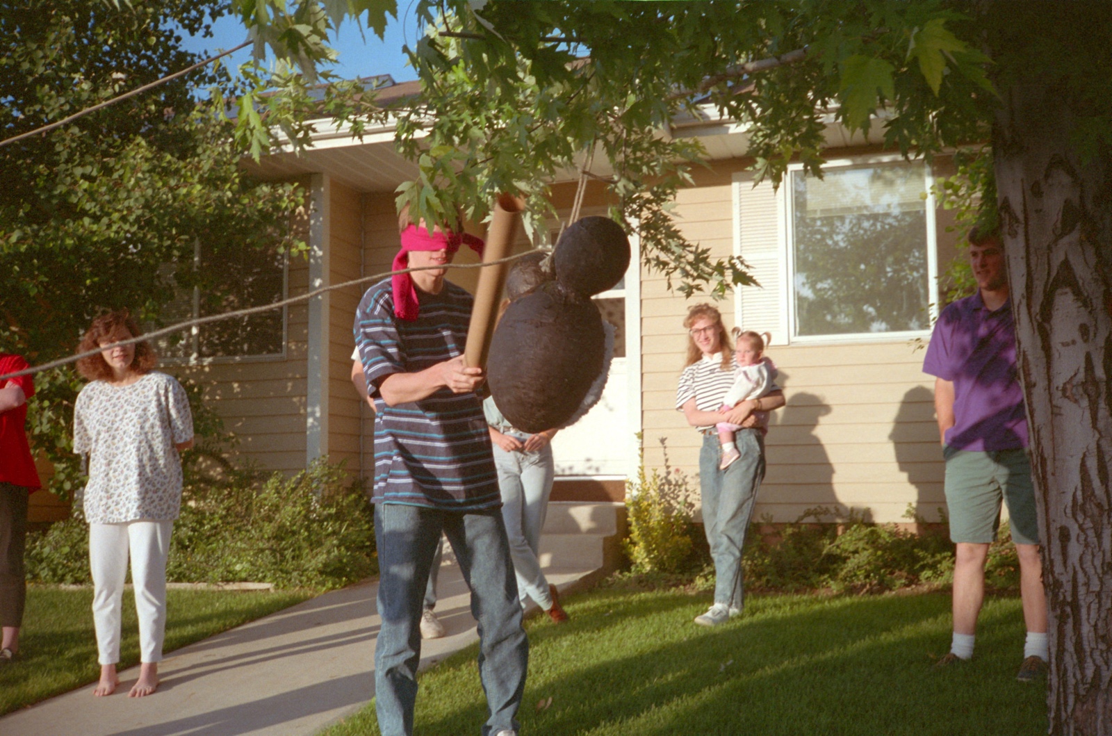 Kelly and Maria were married soon thereafter, and I married Linette that next year as well. One other picture I have from that era shows Maria holding their first baby Amber at my 26th birthday party. Kelly is on the right in purple.
