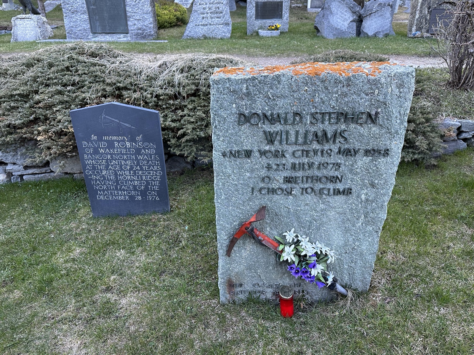 The cemetery had the graves of people who died climbing the Matterhorn. This gravestone has the epithet, "I chose to climb."