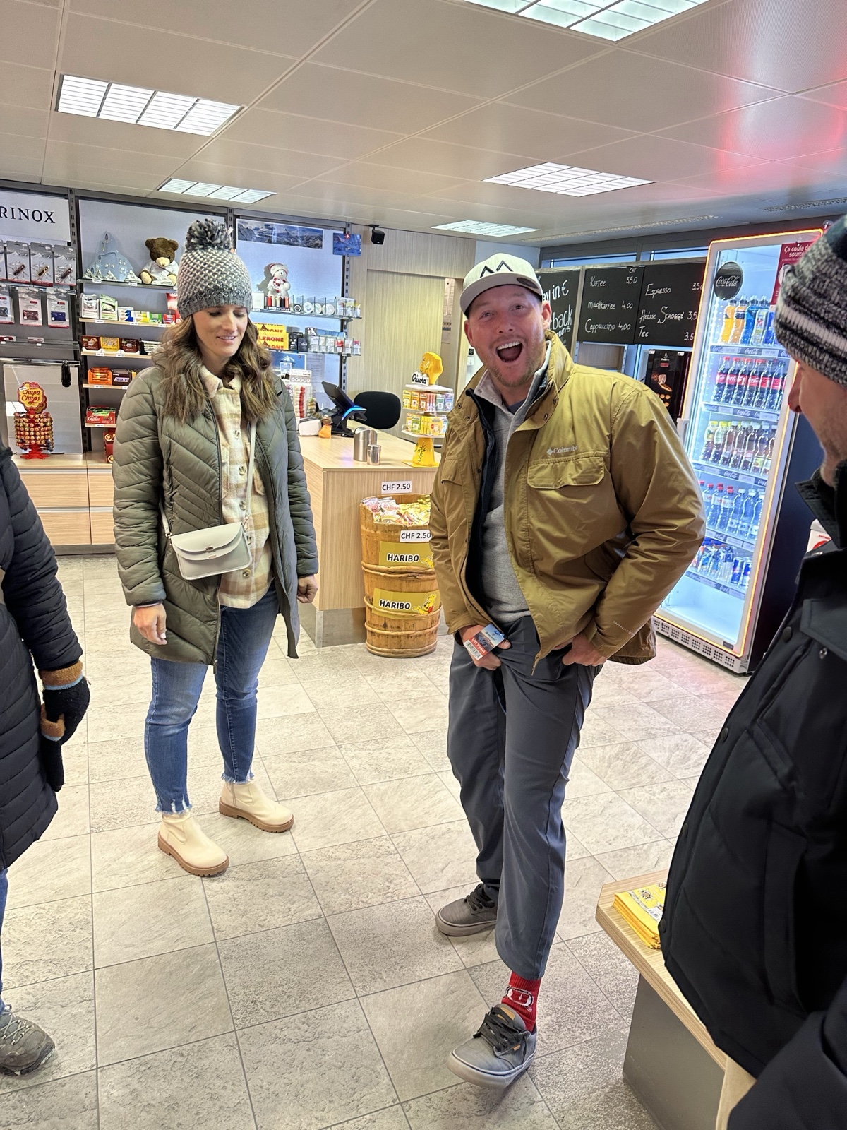 The glare from the snow was strong, so Linette got some sunglasses there. While we were there, someone noticed Kelly's BYU hat and showed us his University of Utah socks!