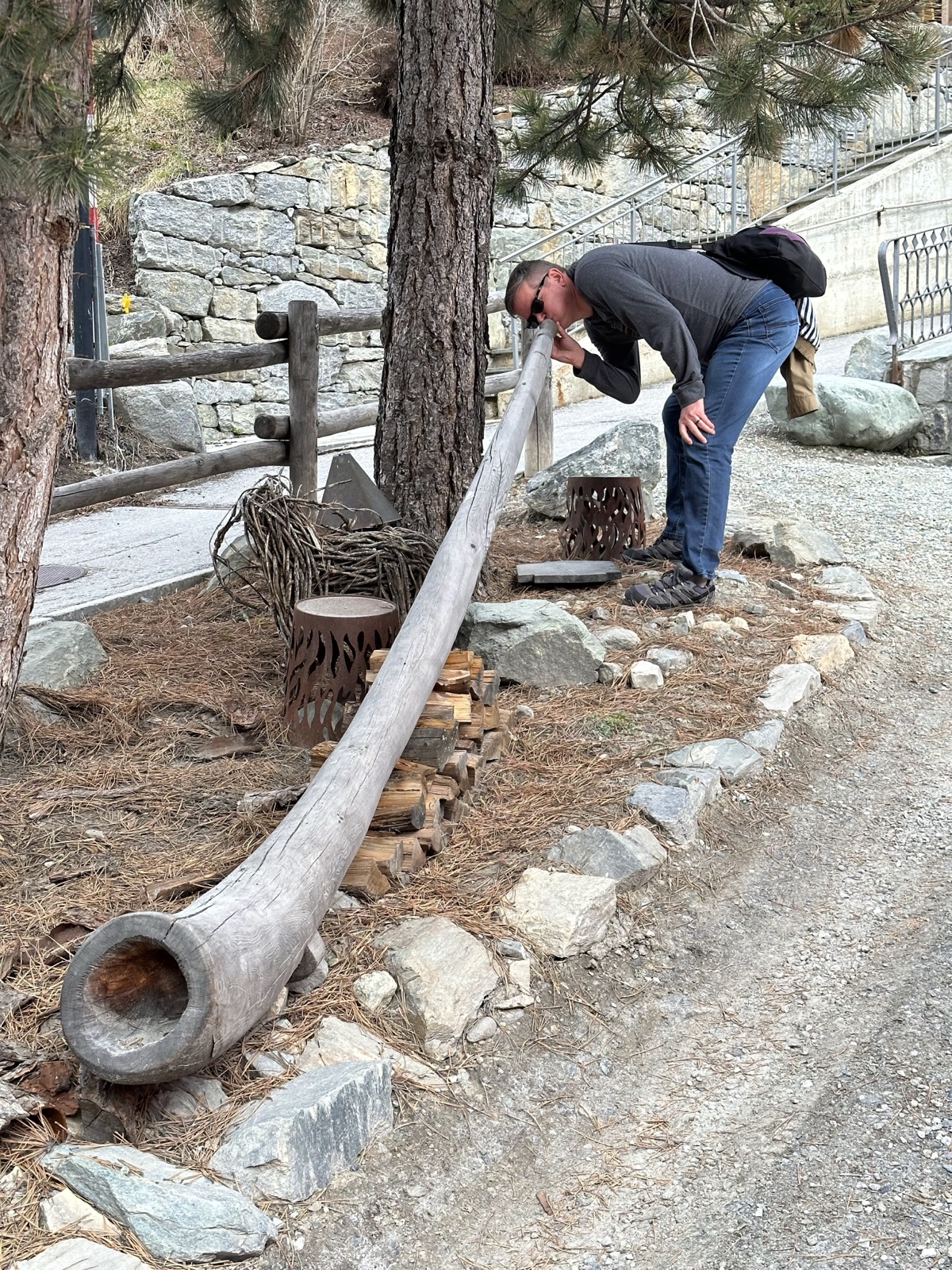 There was a shiny replica of an alphorn going down the steps of this building.