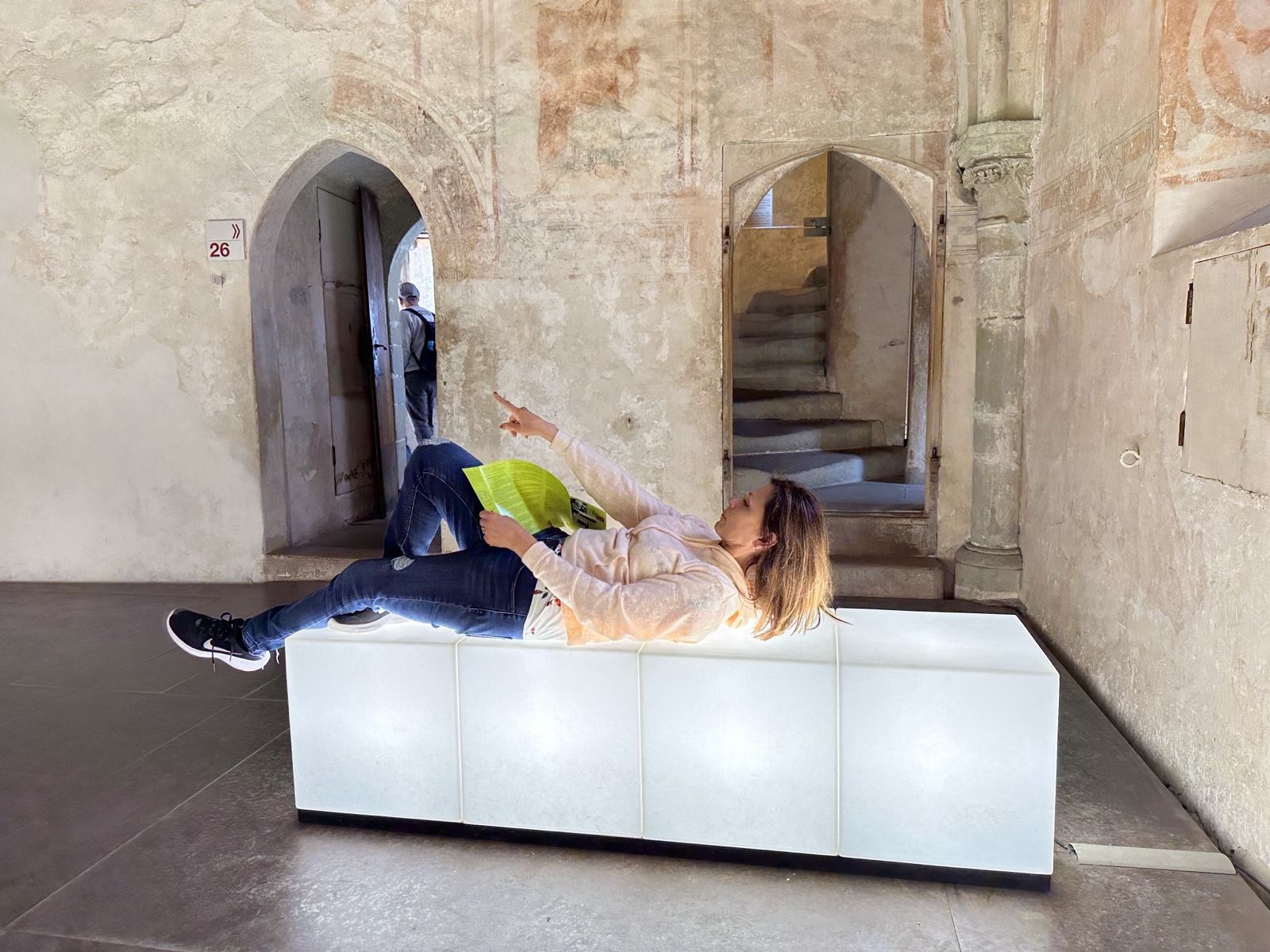 We went into the chapel, and the acoustics were really good. There was also a glowing plastic bench that Linette lay down on for a while.