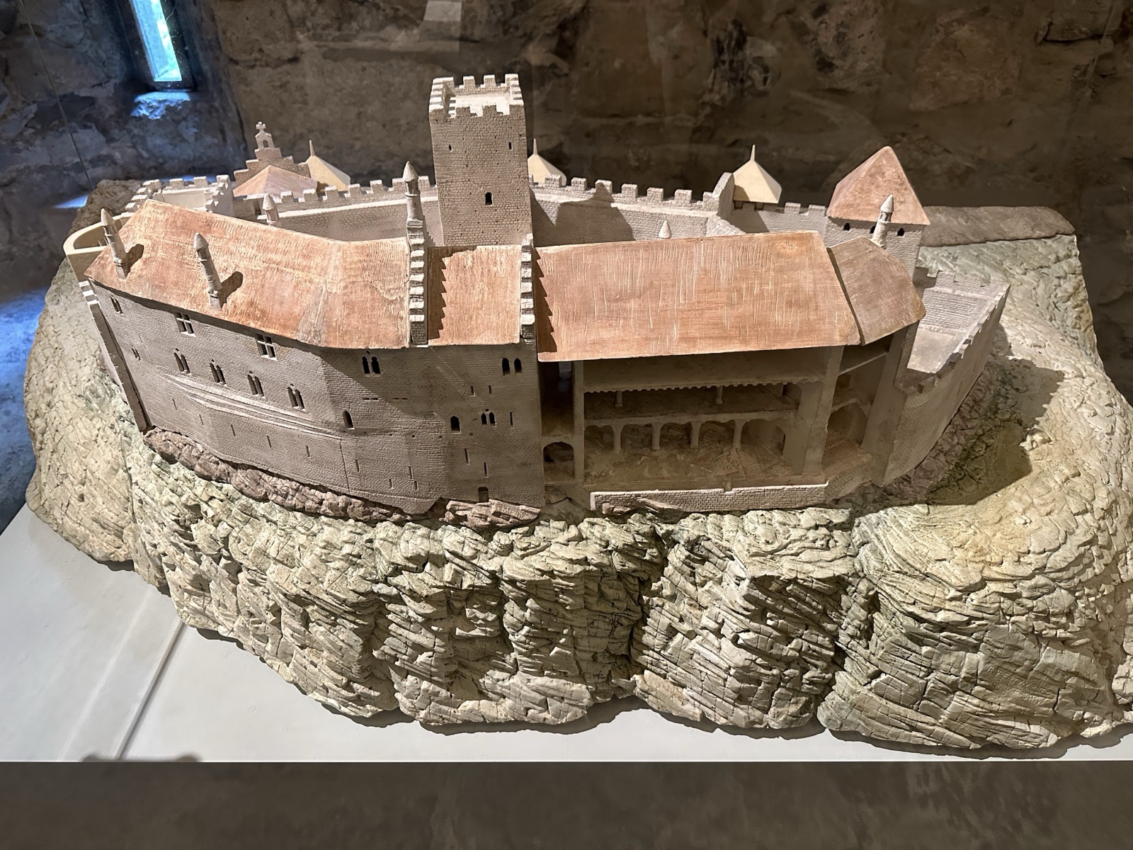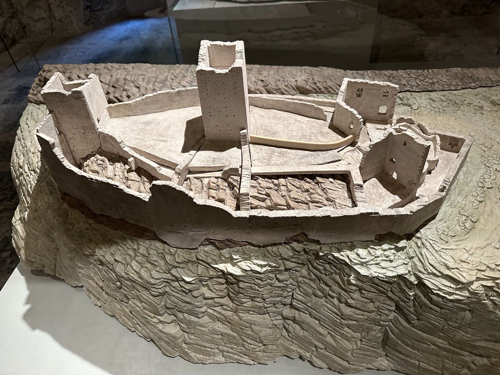 Here is a model showing the original island just off the shore of the lake, with a great drop-off near that.