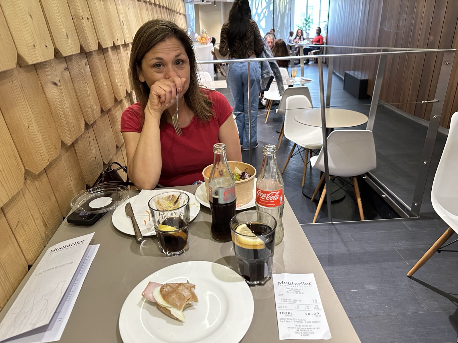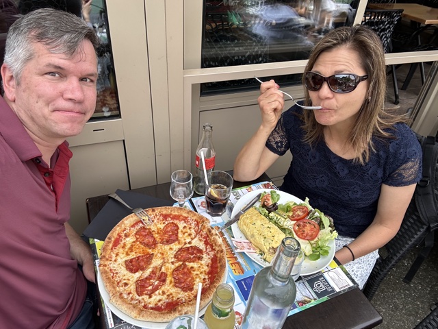 We found a bakery where we got a sandwich and a salad, and then sat down inside and ordered drinks as well.