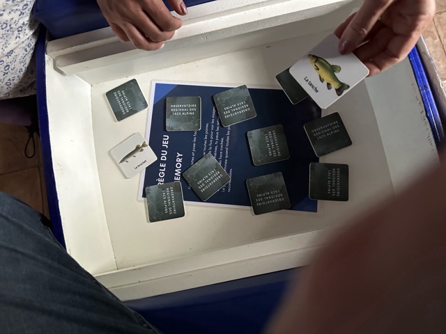 One person could sit on each end, and play a game of "Memory" with various fish inside. The names of the fish were in French, of course.