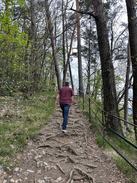 We walked along the river and found a cafe where we stopped for lunch. Food appears to cost about half as much there as in Switzerland. (Switzerland uses its own currency, Swiss Franks, instead of the Euro; and requires stores to stock a large percent of Swiss-made goods. The lack of trade does tend to make prices high, but also maintains a high degree of independence and self-sufficiency.)