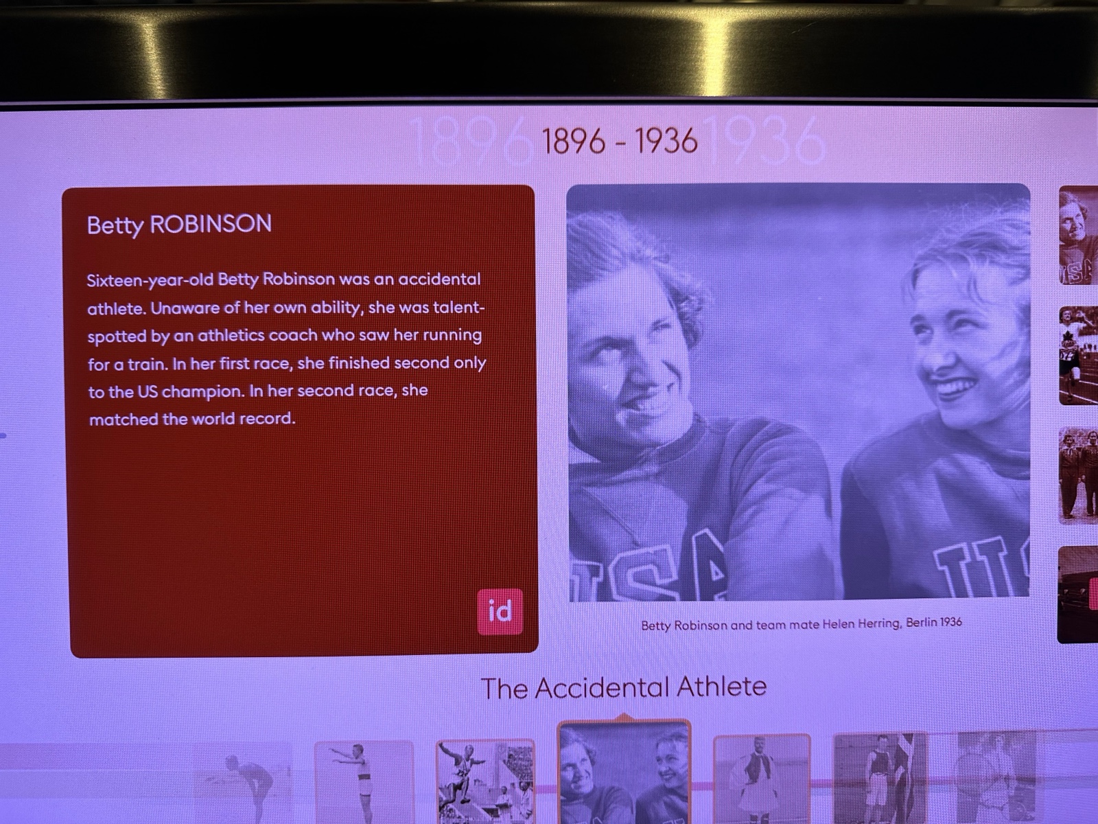 There were some stations with lots of Olympic stories. I love this one about how the runner Betty Robinson was discovered.