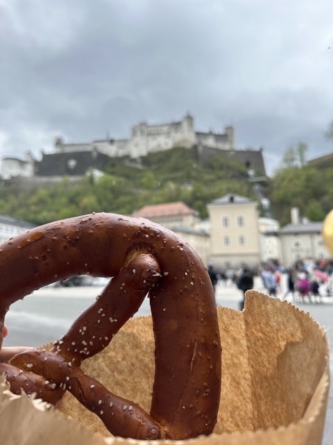 Back in town, we found some really tasty pretzels (salted, cinnamon sugar, apple strudel, and cheesy bacon) and ate them in the plaza until it stared to pour.
