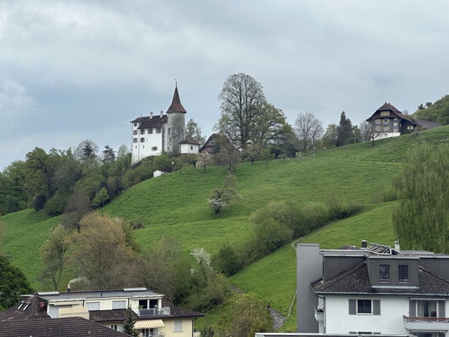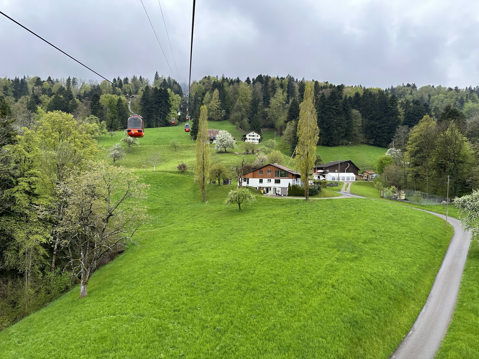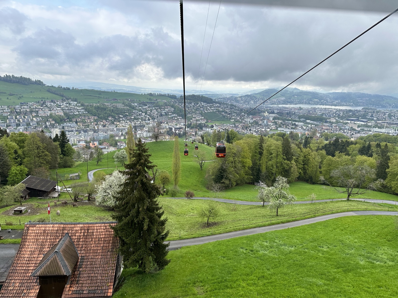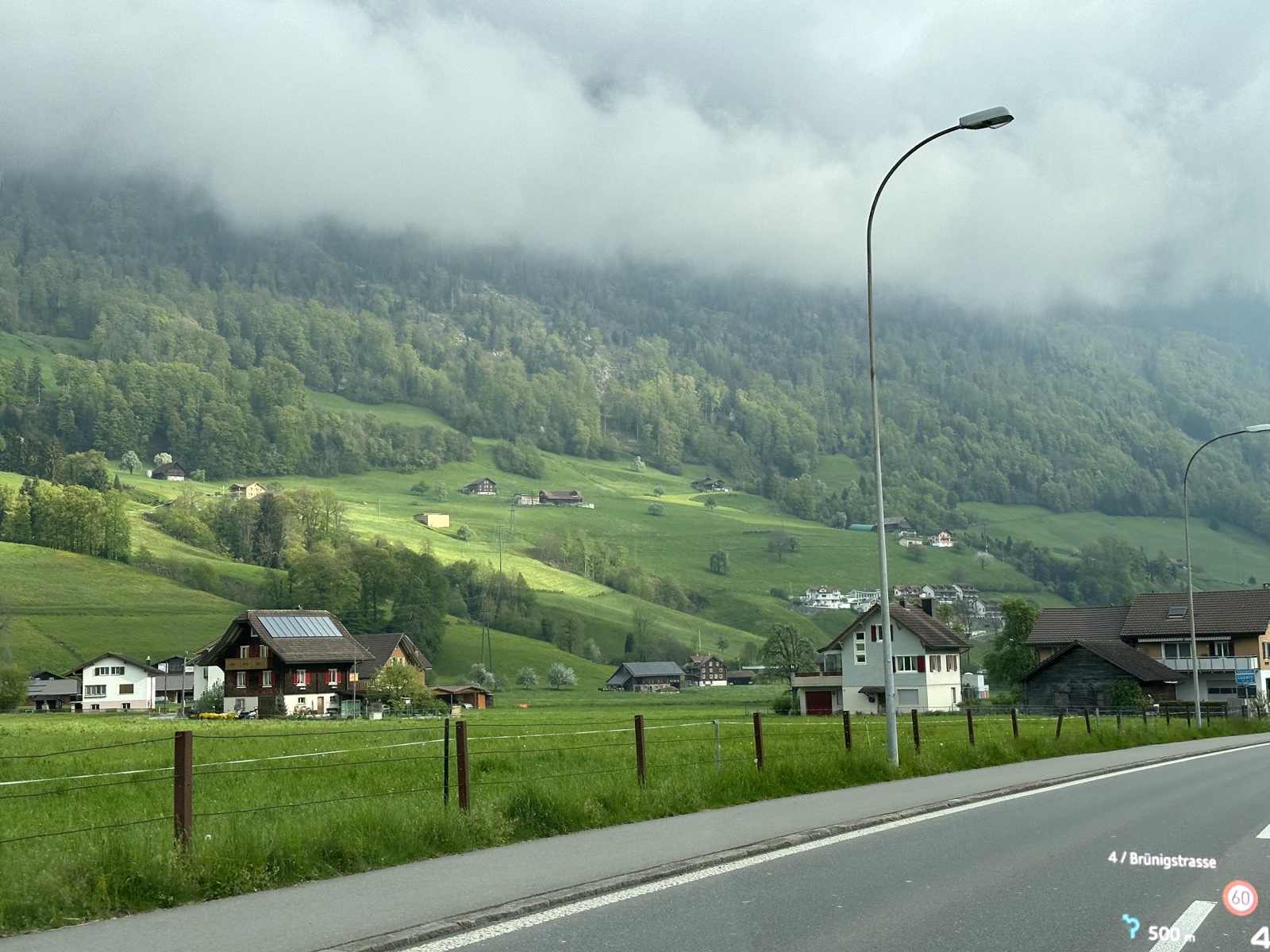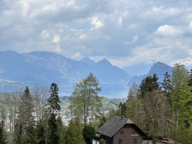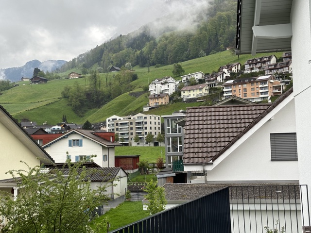 On May 2, 2023, we awoke at our AirBnB in Alpnach, just a few minutes south of Lucerne, and found that we had a nice view off of our balcony of some pretty green hills dotted with houses.