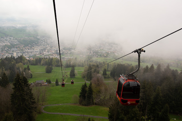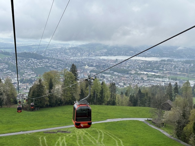 Our first destination was Mt. Pilatus, which is southwest of Lucerne. Since the top of the mountain was clouded over, we decided to buy gondola tickets from Kriens to just the first stop along the way. It cost the same to buy the individual legs separately anyway, so then we could see if things cleared up before deciding to go further.