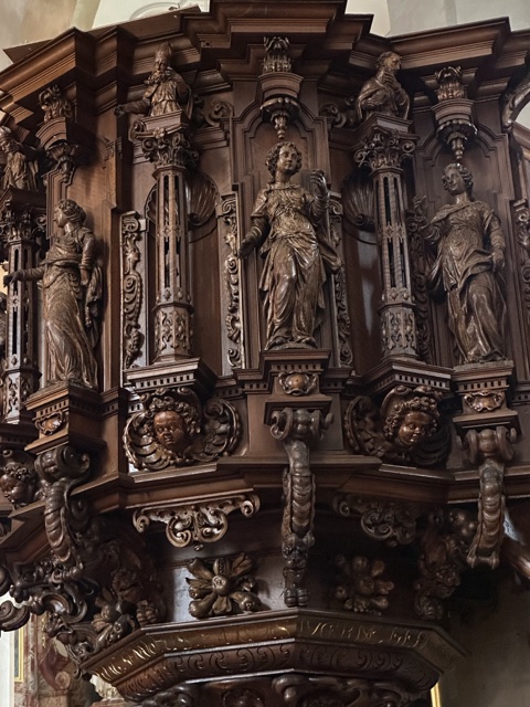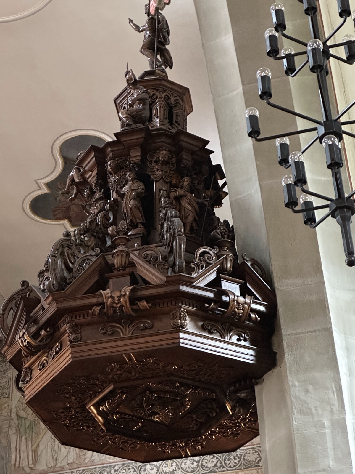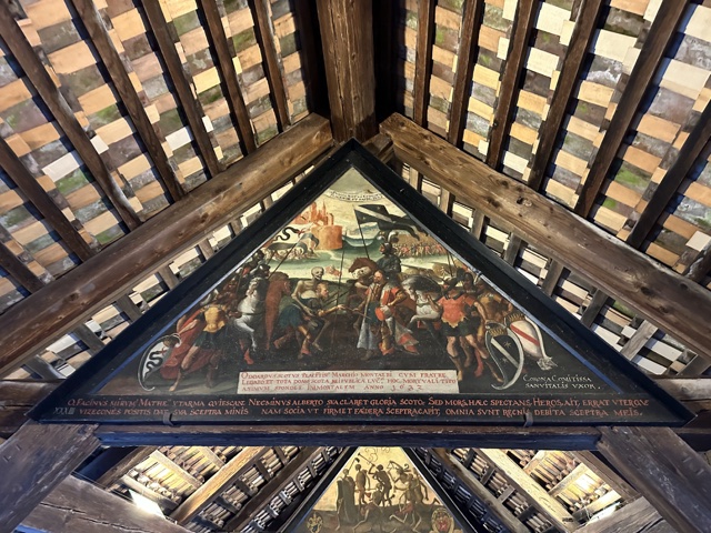 Inside, there is a series of triangular paintings, created from 1616 to 1637. They form a "Dance of Death" (Danse Macabre or Totentanz in German), with creepy skeletons in most of them.