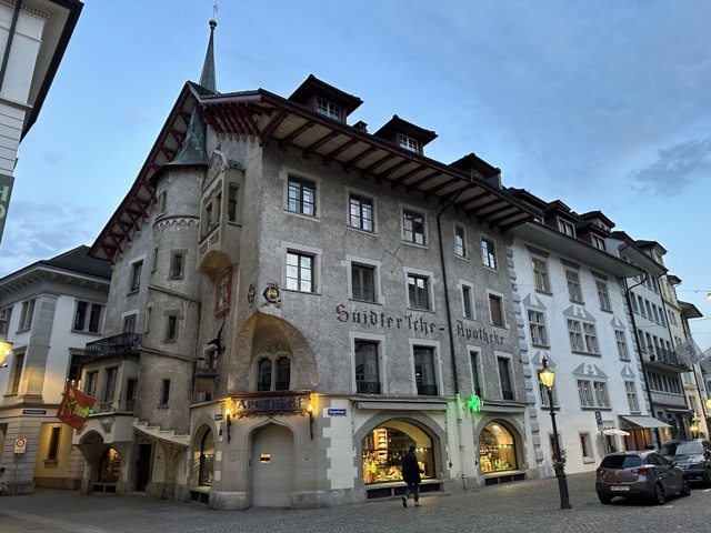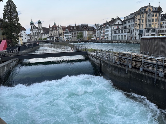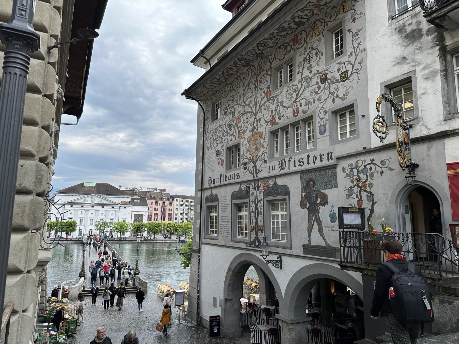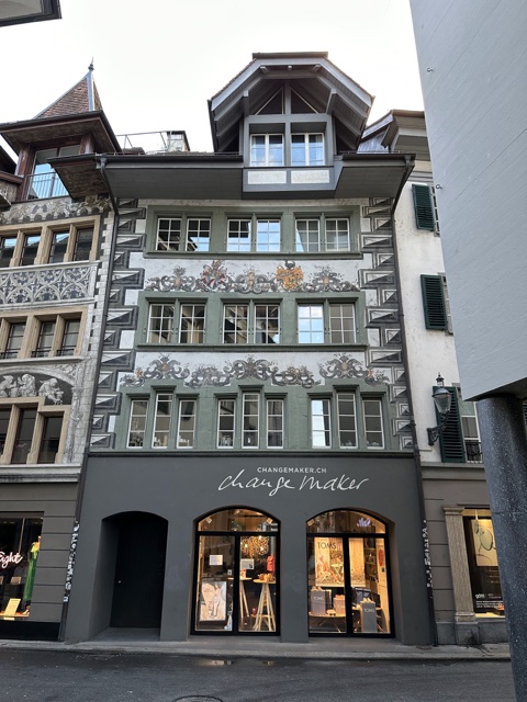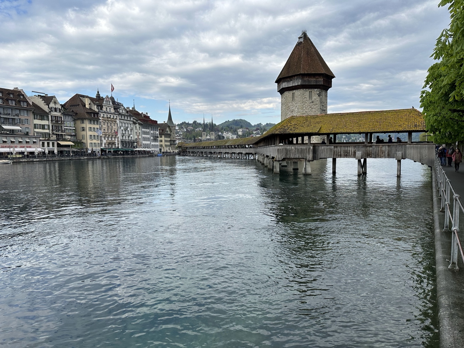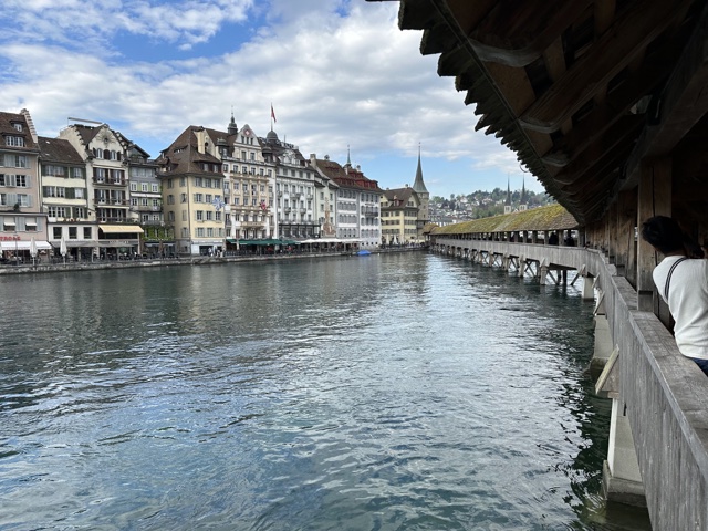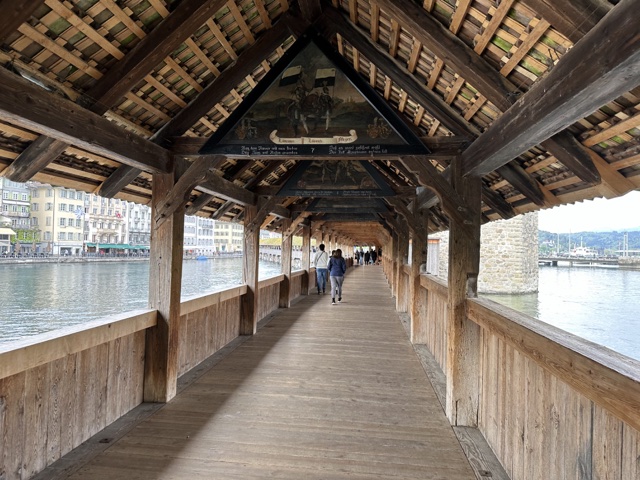 Our last stop in Lucerne was the other famous covered bridge, the Spruer Bridge (Spreuerbrücke), which you can see here in two sections (with the old city wall and a tower in the distance). This covered bridge was built in the 1200s, destroyed in a flood in 1566, and then rebuilt.
