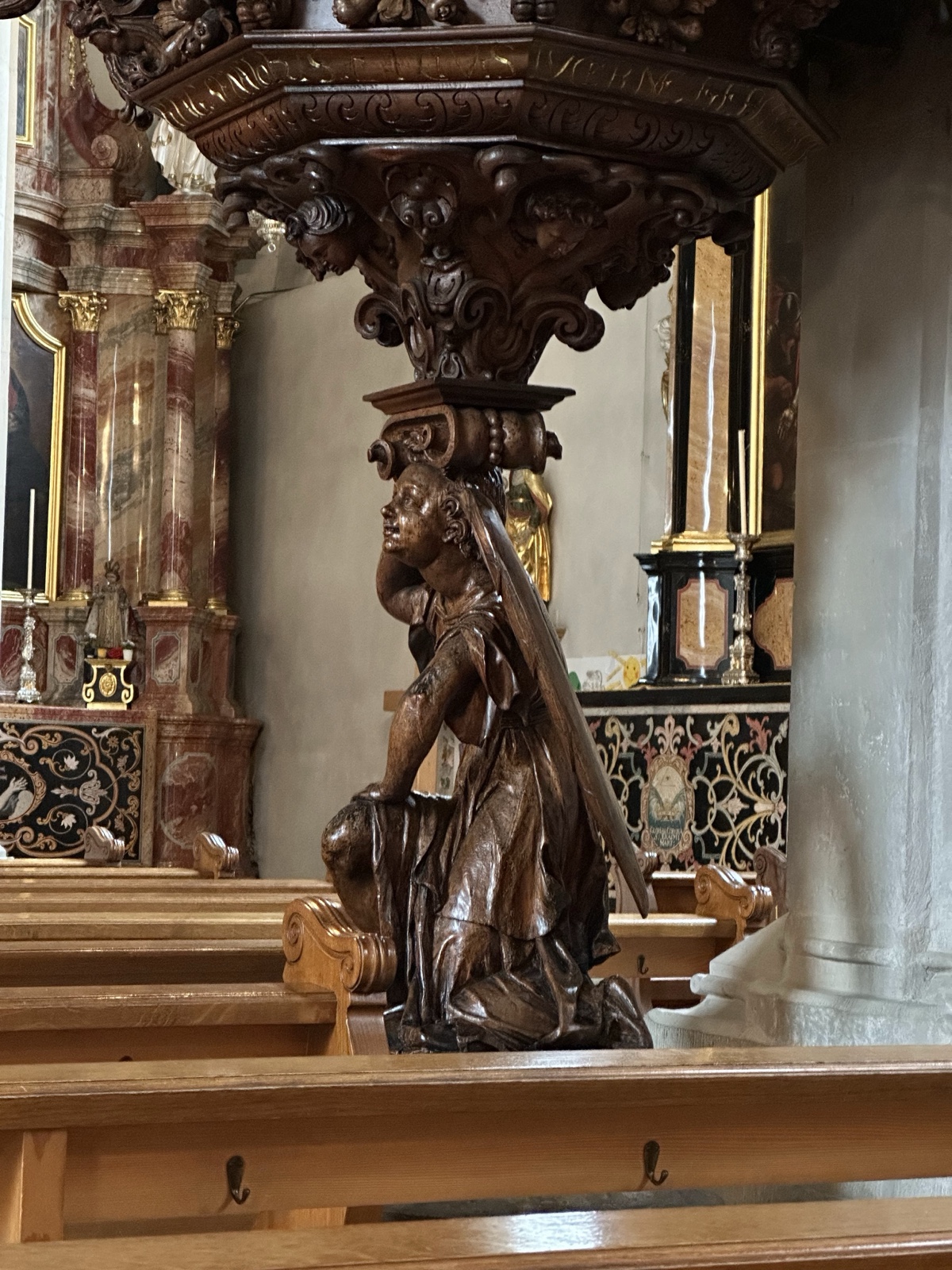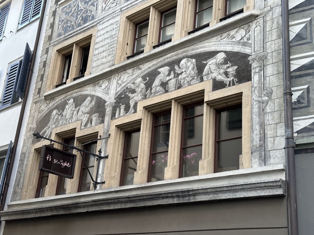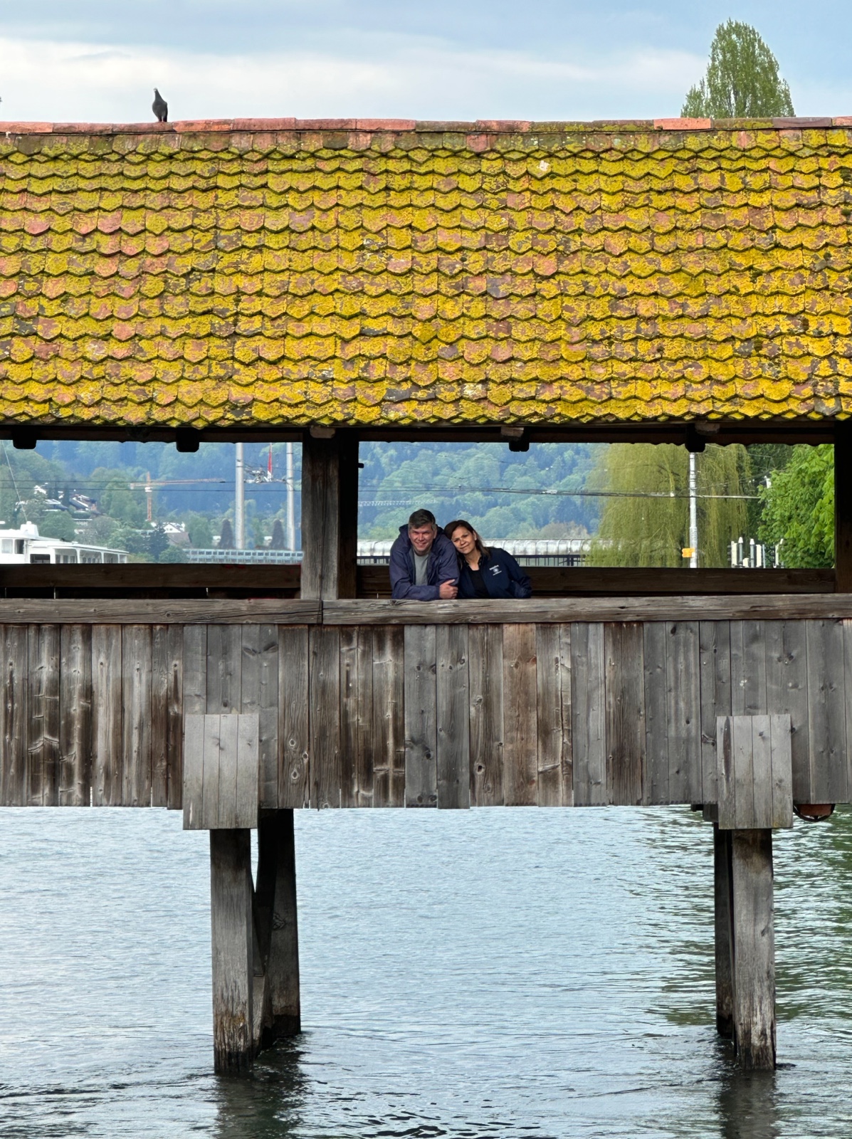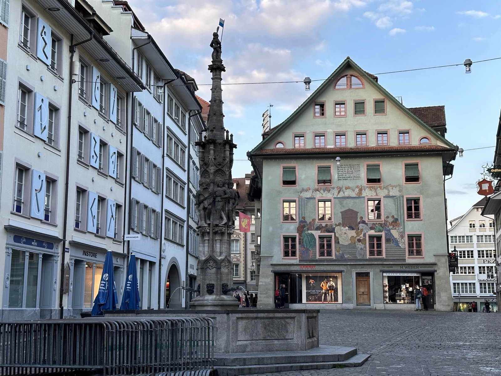 Our last stop in Lucerne was the other famous covered bridge, the Spruer Bridge (Spreuerbrücke), which you can see here in two sections (with the old city wall and a tower in the distance). This covered bridge was built in the 1200s, destroyed in a flood in 1566, and then rebuilt.
