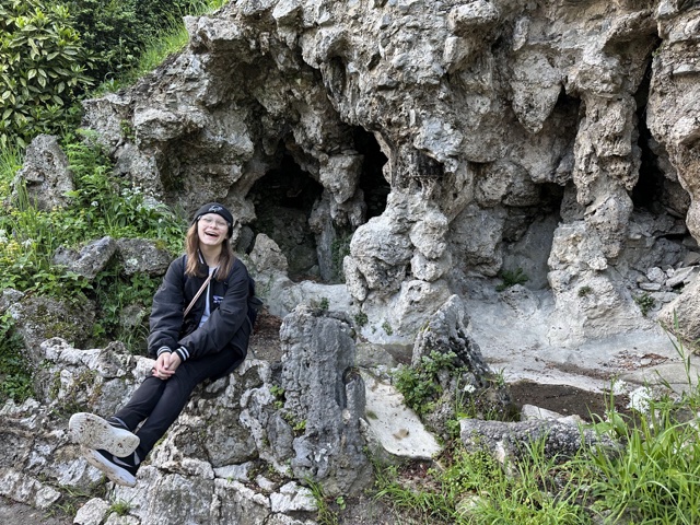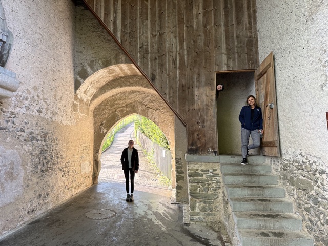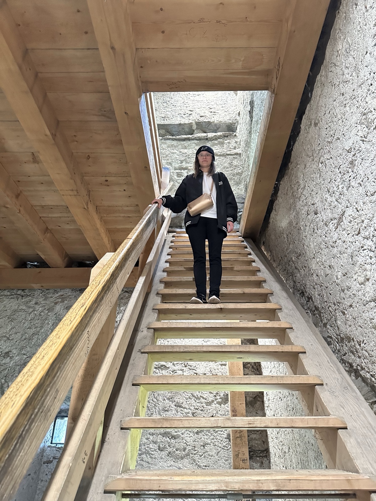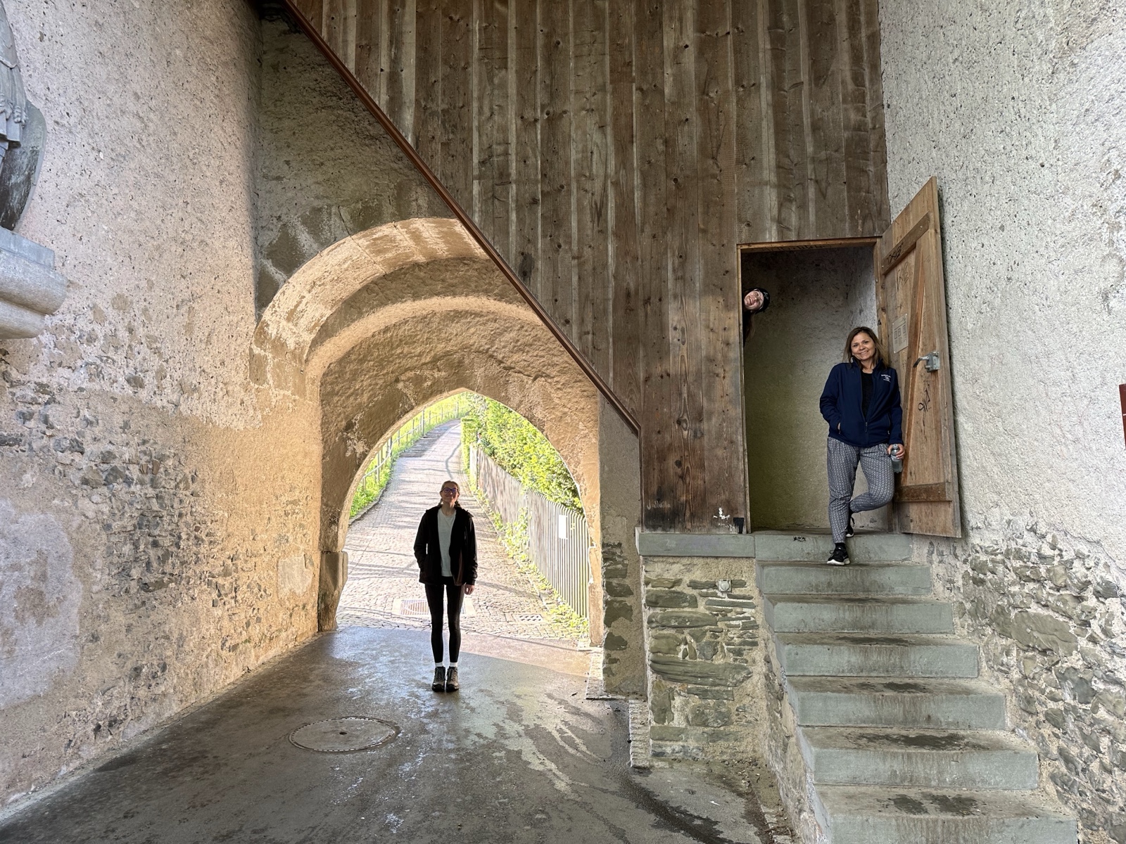 Here you can see Mikayla in the arch, Linette at the door that goes up the stairs, and Sienna photobombing from a couple of steps up. You can tell from the diagonal ceiling how steep the stairs were.