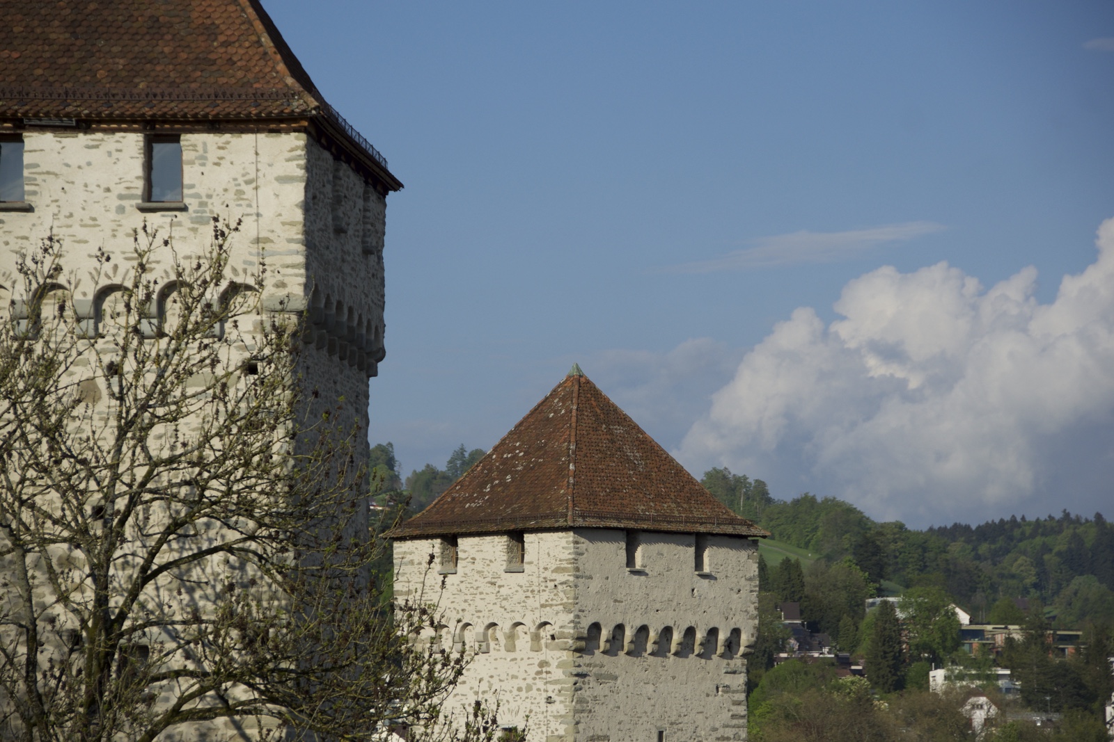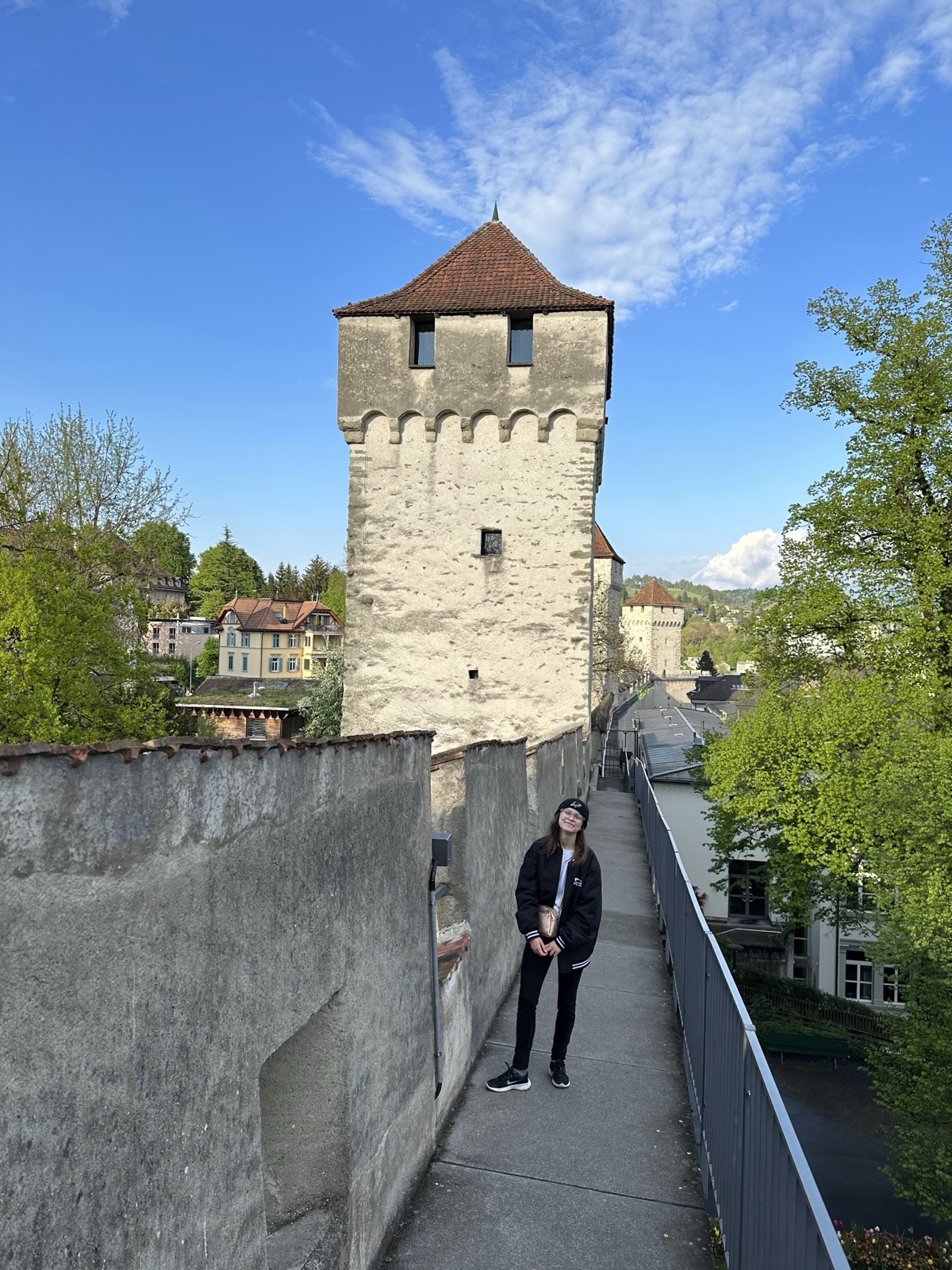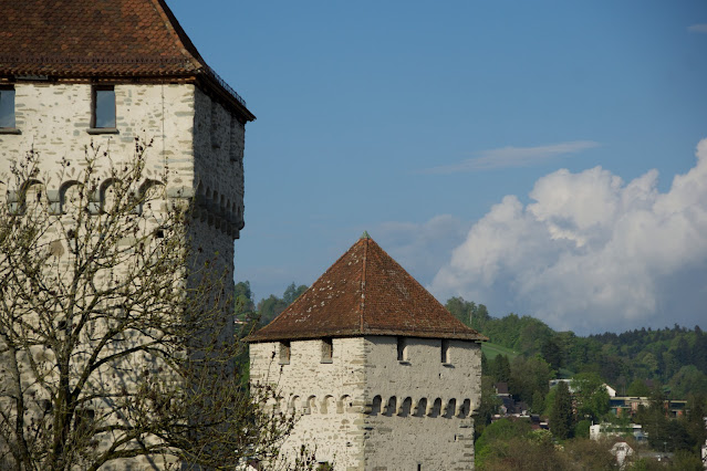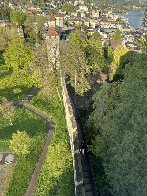 After dinner, we walked over to the old city wall (called the Museggmauer, where "Musegg" is this area in the heart of Lucerne, and "mauer" means "wall"). It still has a series of nine towers.