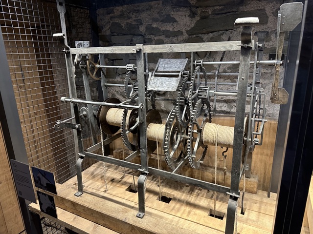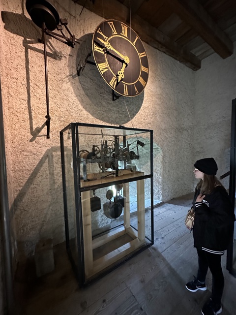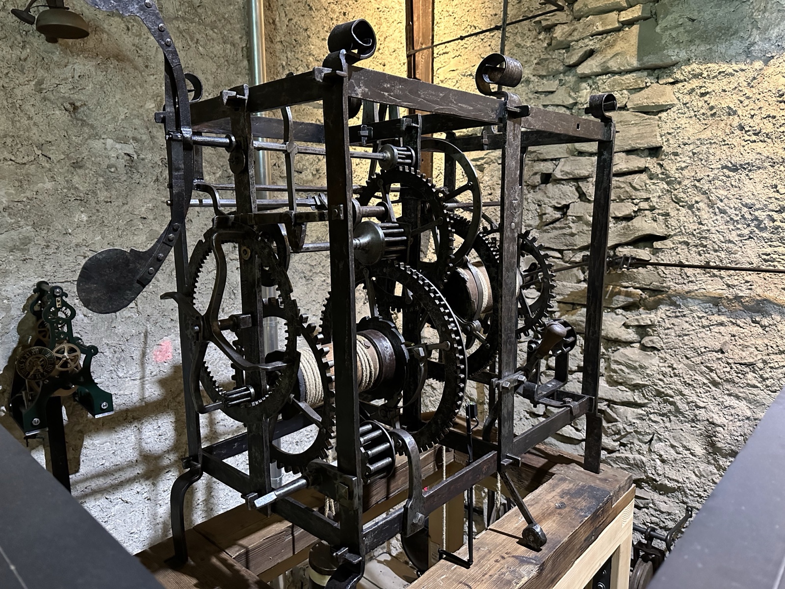 Here is a short video showing the 3-story pendulum that powers the main clock on the clock tower, along with some other gears going inside, and some bells ringing across the town at 7pm.