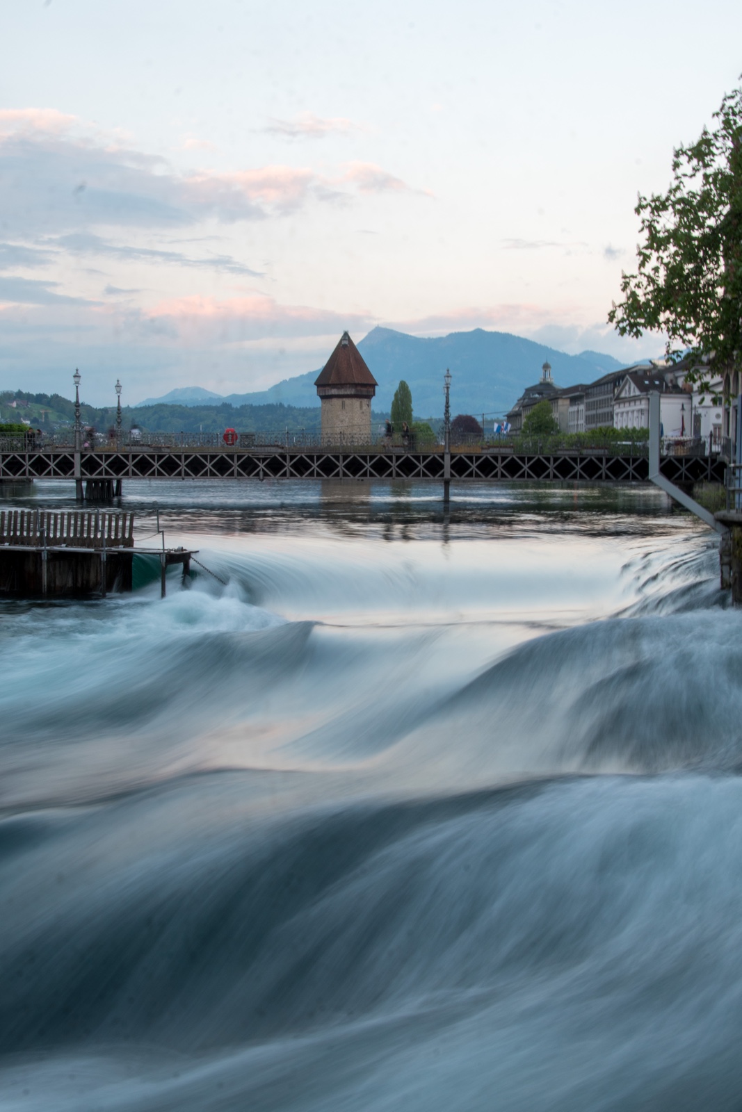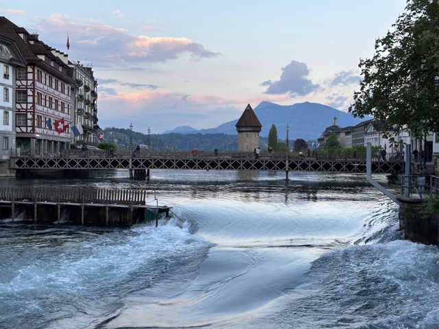 Whenever we walked within sight of the Chapel Bridge, we couldn't help but take more pictures, especially with the sunset lending some pink to the clouds.