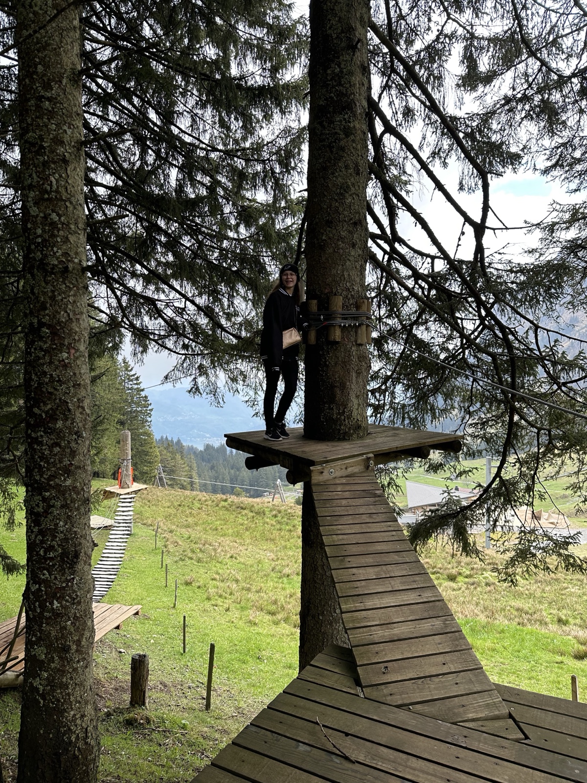 Instead of paying for the return ride, we decided to go on a bit of a hike back down the hill to where our first gondola stopped. There is a zip line course up there, so Sienna just walked out to one of the platforms for fun.