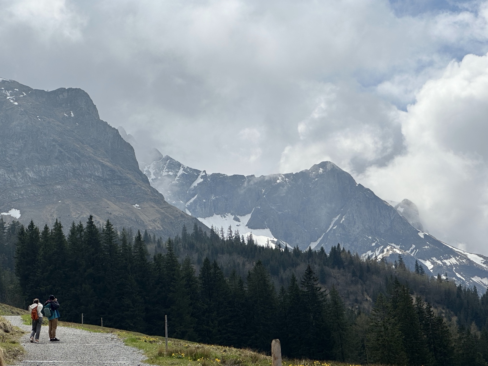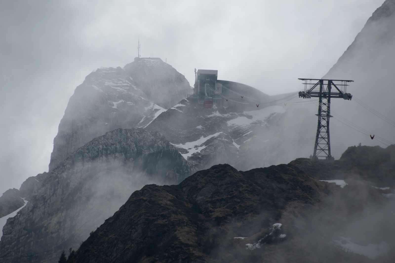 At Fräkmüntegg, we looked down at the mountain, partially shrouded in clouds.