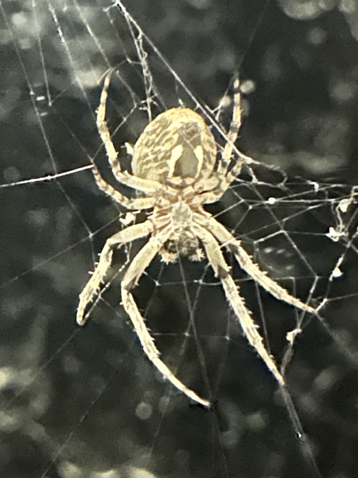 Finally, I climbed my way back into the car, backed out, loaded everyone up, and we headed to our AirBnB again. Out the window of our AirBnB, I was able to get a close-up of this beauty. (Larinioides sclopetarius, or "bridge spider", it turns out. They don't bite people often, and then it's not bad).